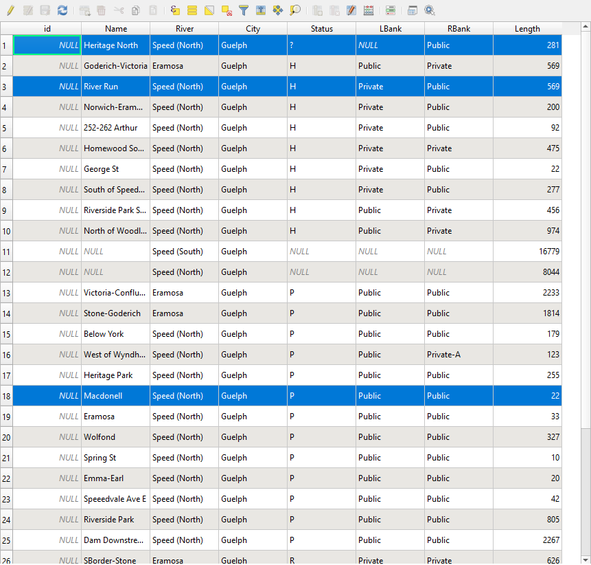After much slicing and dicing, and adding in metadata, I created the Guelph Riverbanks project. You can now see what stretches of river (i.e. a characterization of both banks) have public access, and a breakdown of each bank in terms of a category.