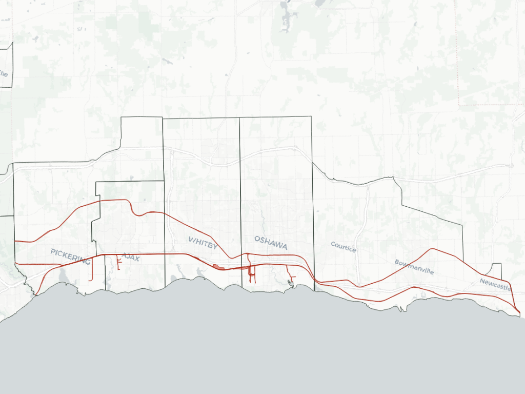The East GTA consists of the urban nearshore areas of Durham Region: Pickering, Ajax, Whitby, Oshawa and Clarington. The total area of analysis, while still covering some small rural parts and part of an urban nation park, is only roughly the size of Toronto. That said, it is defined by several smaller watersheds rolling south from the Oak Rides Moraine, nuclear energy and major industry, as well as railways and highways linking the rest of the GTA with eastern parts of Ontario.