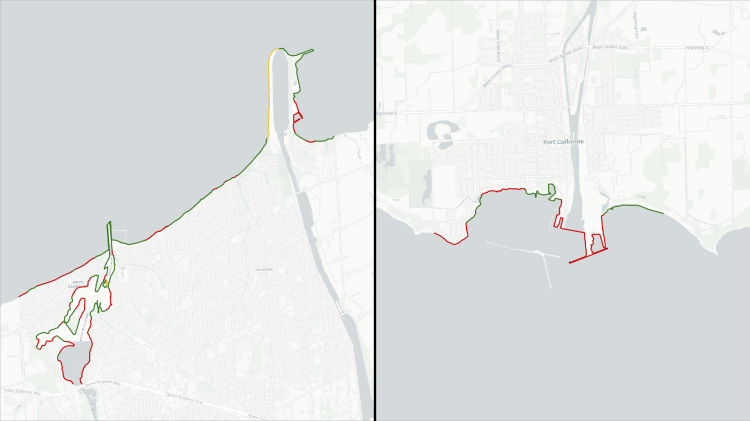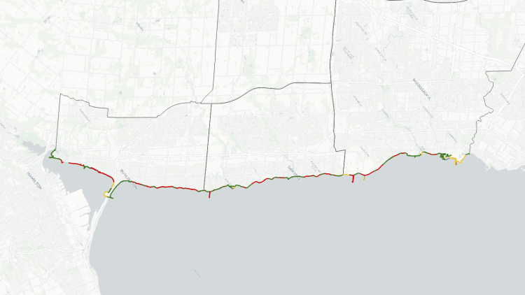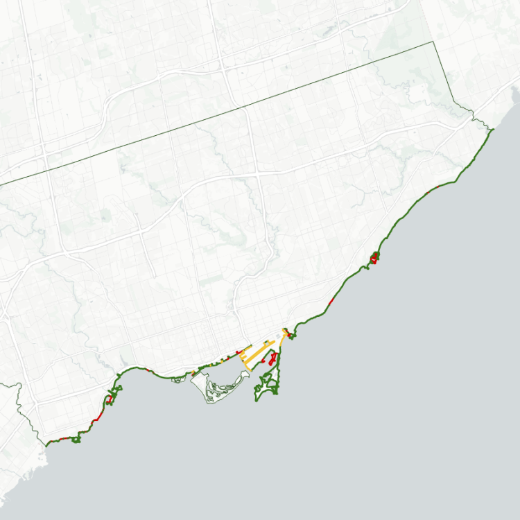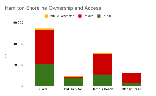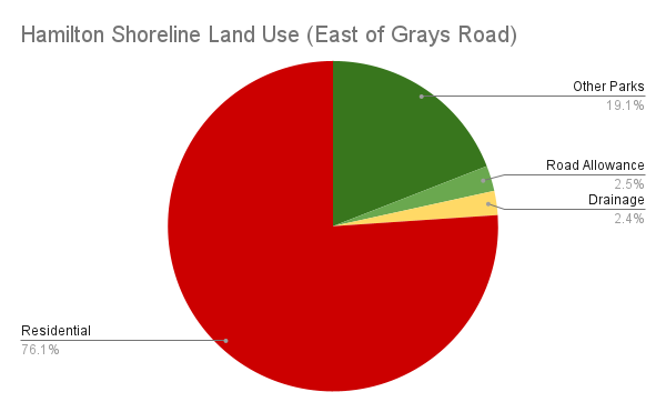 Overall, only 38% of Hamilton’s shoreline is publicly accessible. Less than 7% of it is provided in Stoney Creek. Furthermore, most of Stoney Creek’s public shoreline is highly fractured; excluding Fifty Point Conservation Area, the median piece of public shore is 39 metres long.