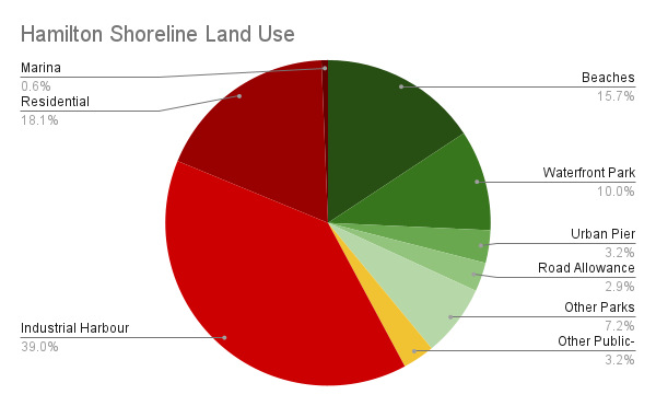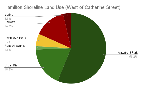 Excluding the industrial port and the sand bar will tell you 3/4 of the shoreline is publicly accessible, and it’s increased as the city grows. Bayfront and Pier 4 Parks added a significant amount of public shoreline when they opened in 1993. Piers 5-8, as well as improvements in Macassa Bay, have slowly added a public urban edge to see the harbour in the last two decades.