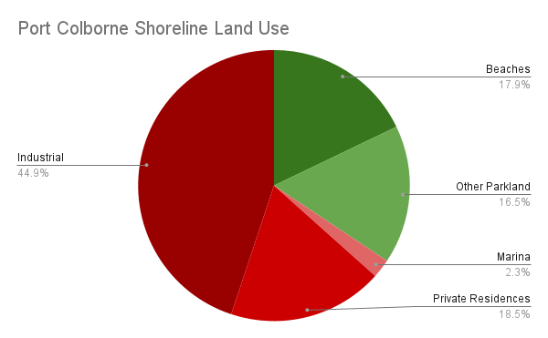 On the Lake Erie side, the focus is the urban boundaries of Port Colborne. It’s 6 kilometres as the crow flies, but the bend of Gravelly Bay and inlet to the Welland Canal extend this to 10 kilometres. Again, a third of this is public parkland in the form of beaches and other green spaces. But there’s nothing else public on top of that. A marina and private residences take up 21% of the shore. The remaining 45% is industrial lands at the Welland Canal, with mills and silos on the west side, and Snider Docks on the east side.