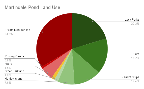 Just under 60% of it is public, however, I feel like this warps the real quantity of parkland available. Only half of it is truly deep parkland, split between the public portion of Henley Island, as well as Royal Henley and Rennie Parks. The other half is in shorewalls and piers leading out from the headpond, strips in behind some residences, and the edges of a couple roads. One third of the shoreline is private residences, and the remaining 8% is a marina, hydroelectric plant and the Henley Island Rowing Centre.