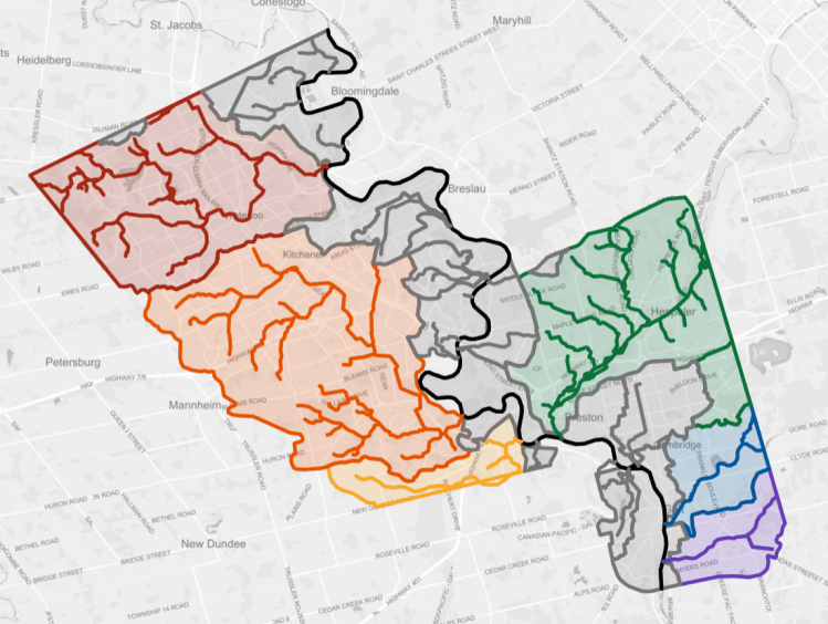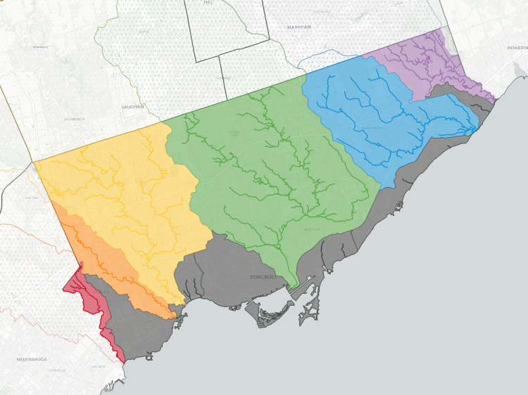 Municipalities and conservation authorities usually provide very detailed GIS maps of every shed and watercourse, and/or broad scale static maps of the sheds and the largest watercourses only. These maps are something inbetween, to help provide some insight as to what watershed you’re in, and hep you follow along as you explore your local metroscapes.