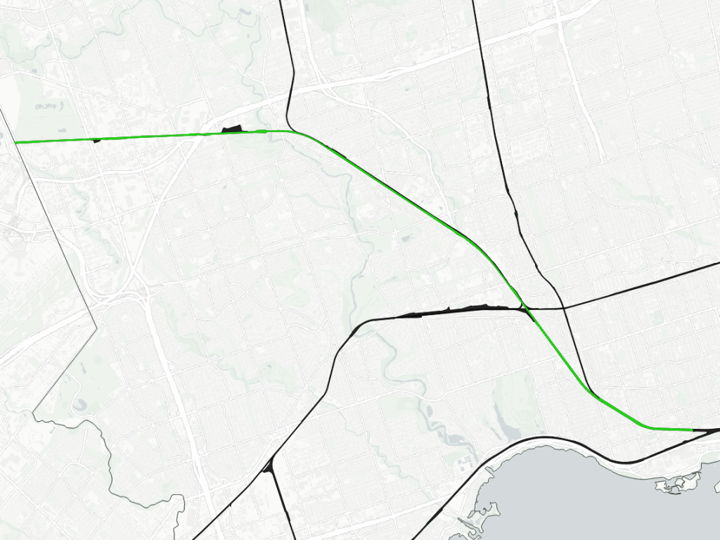 Major upgrades to this line were completed in 2023, when the line was elevated on a guideway over CPKC’s North Toronto Sub. This is part of a broader project that will open up a great deal of opportunity for public space under and parallel to it.