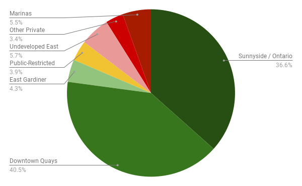 For the purposes of this project, I have broken up this stretch to go only as far east as the Don River, so that the Port Lands can analyzed separately. I will refer to it as the “downtown shoreline”, which can be broken into two distinct segments: the open parkland stretch that includes Sunnyside and Ontario Place, and the “central waterfront” that exists south of Queens Quay and Lake Shore Boulevard.