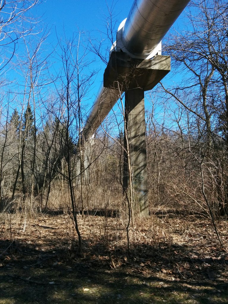 Huge pipe carrying drinking water over creek water.