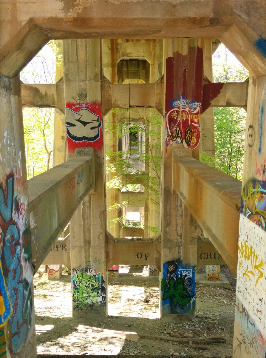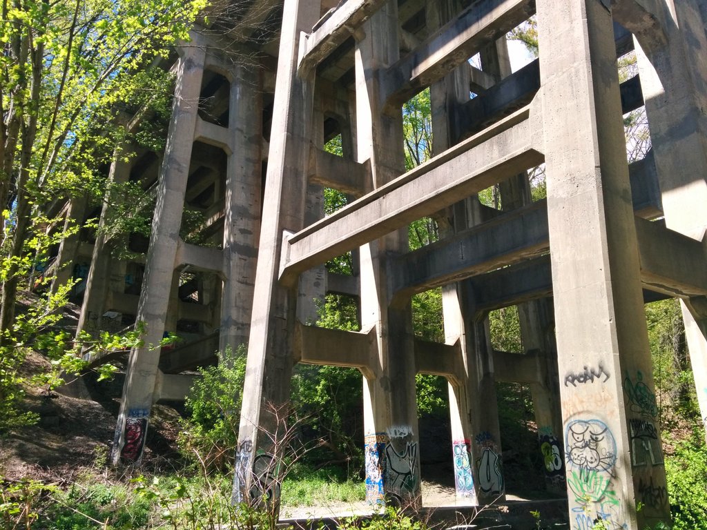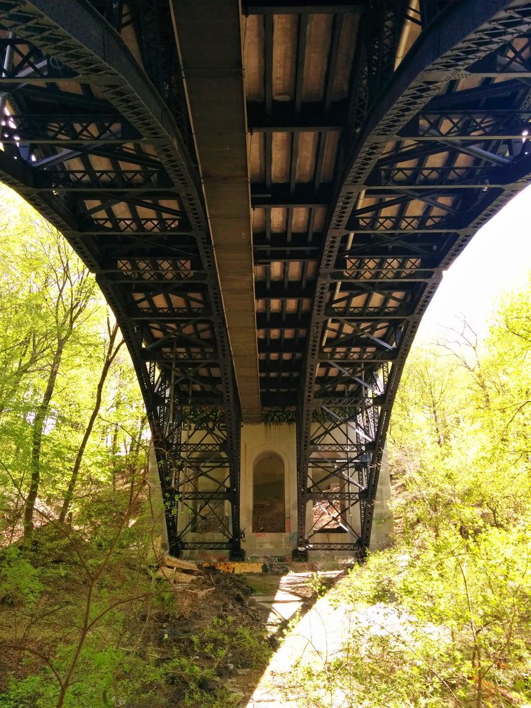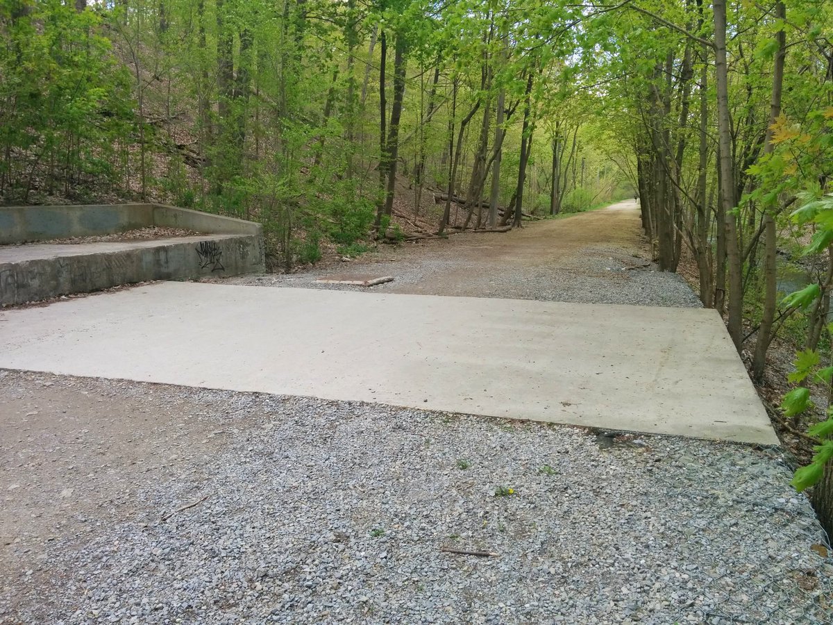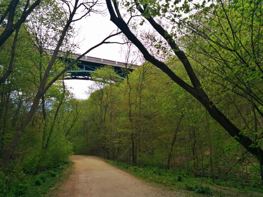 Yellow Creek stays buried under a trail doubling as a public works access road. We pass under another great bridge.