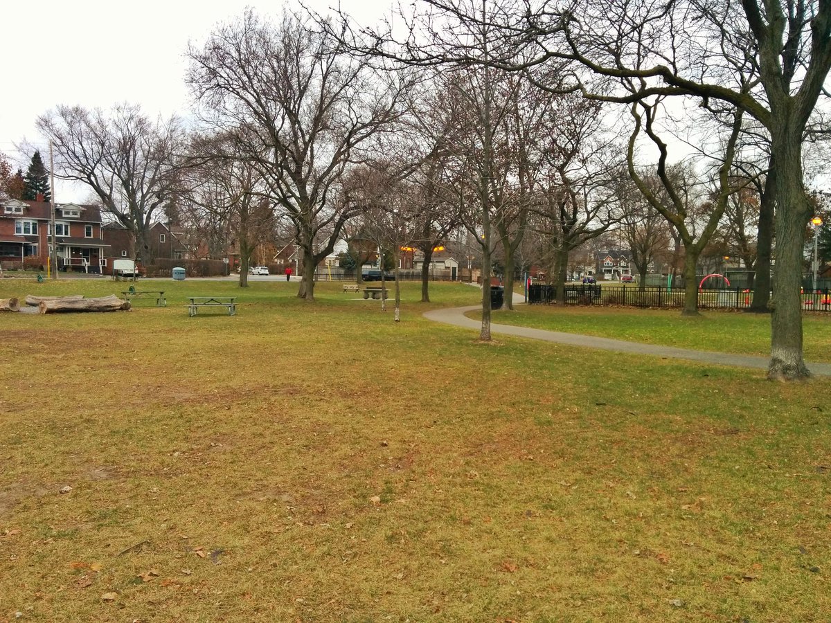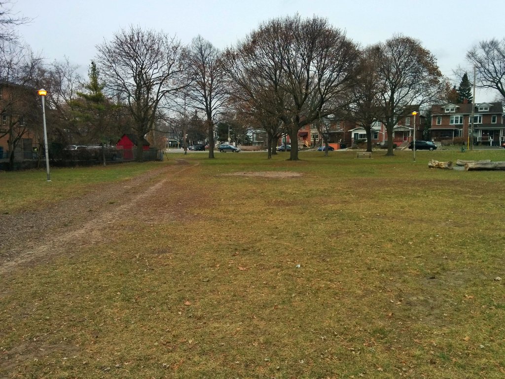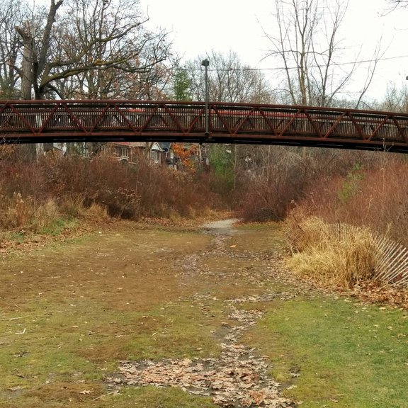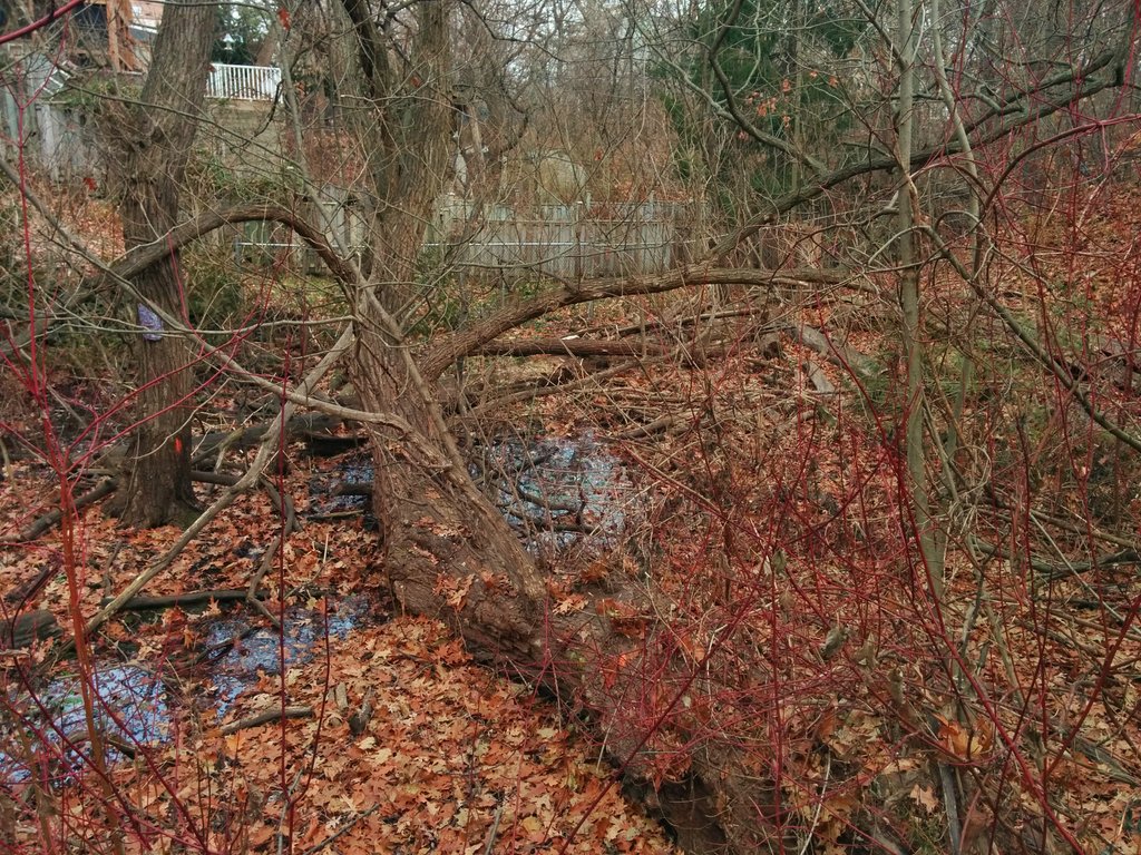 Today I’ll be following a series of small and mostly lost creeks in Toronto’s Beaches area. The first is Smalls Creek. It starts in Merrill Bridge Road Park north of the tracks, through private backyards.