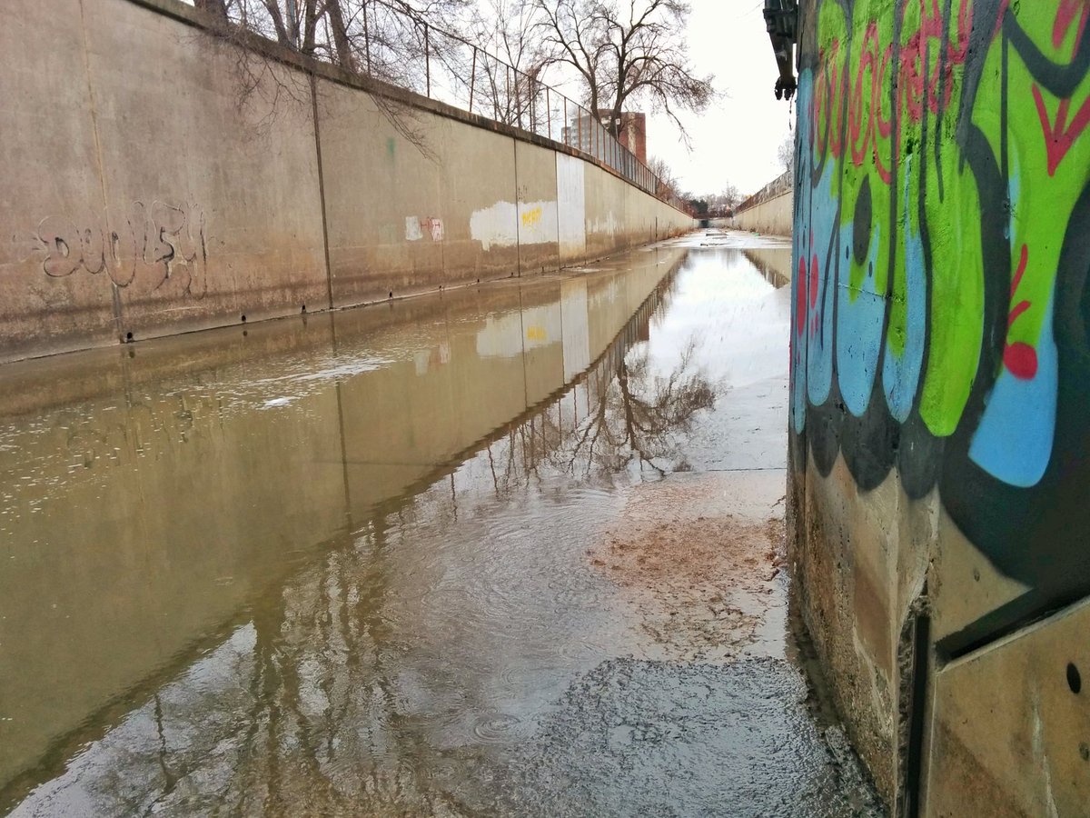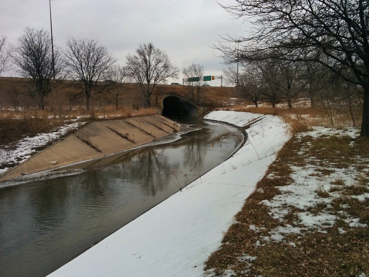 Giant culvert through a berm. Very pretty, but they still couldn’t bother to accommodate the trails through here; users must cross at grade unless you are walking the concrete channel bed like me.