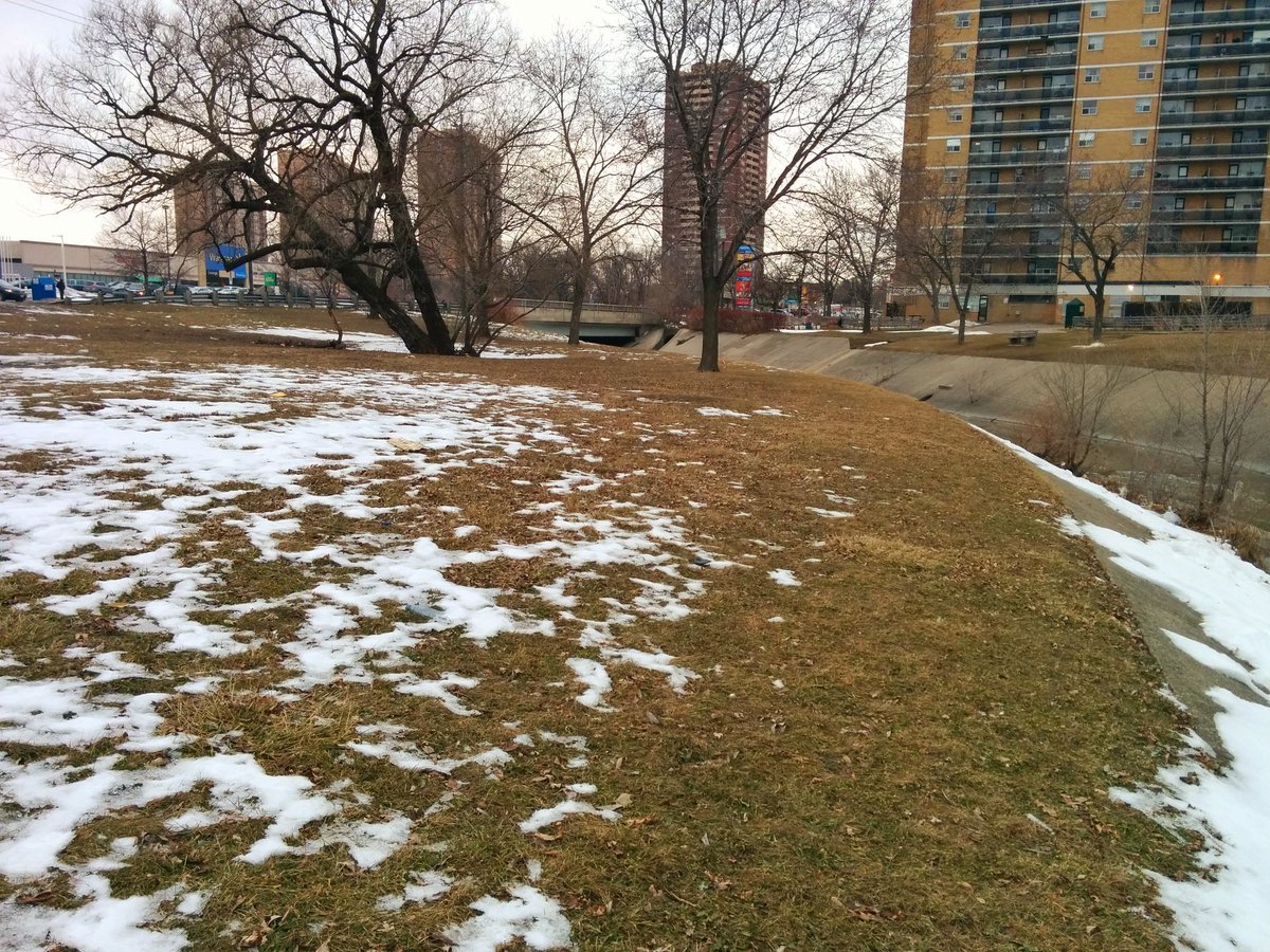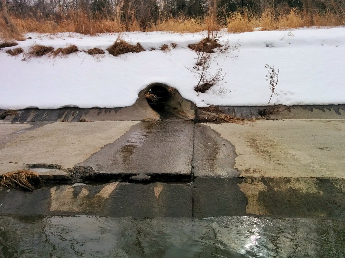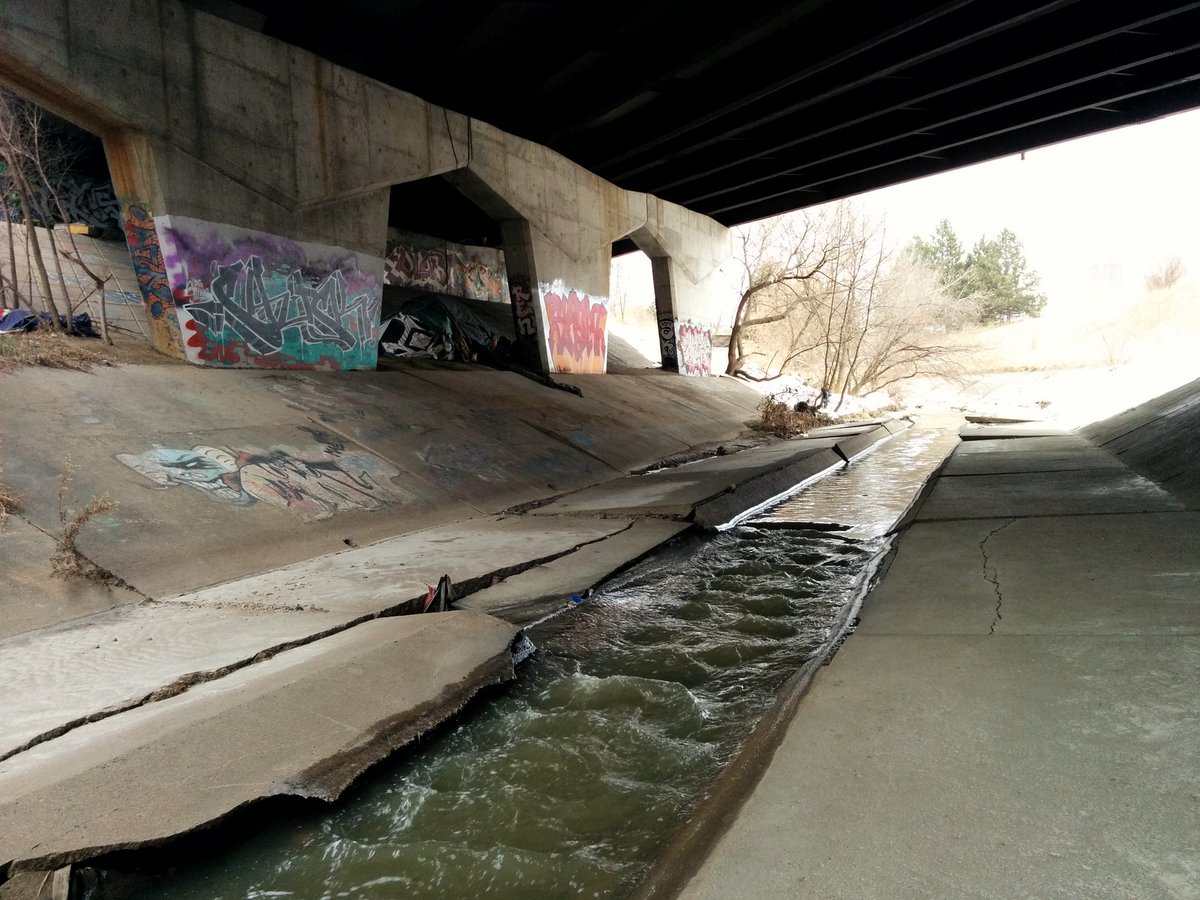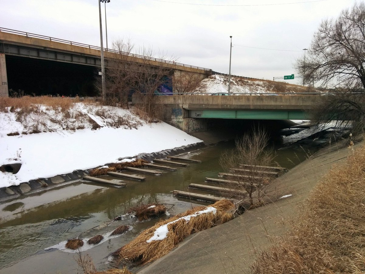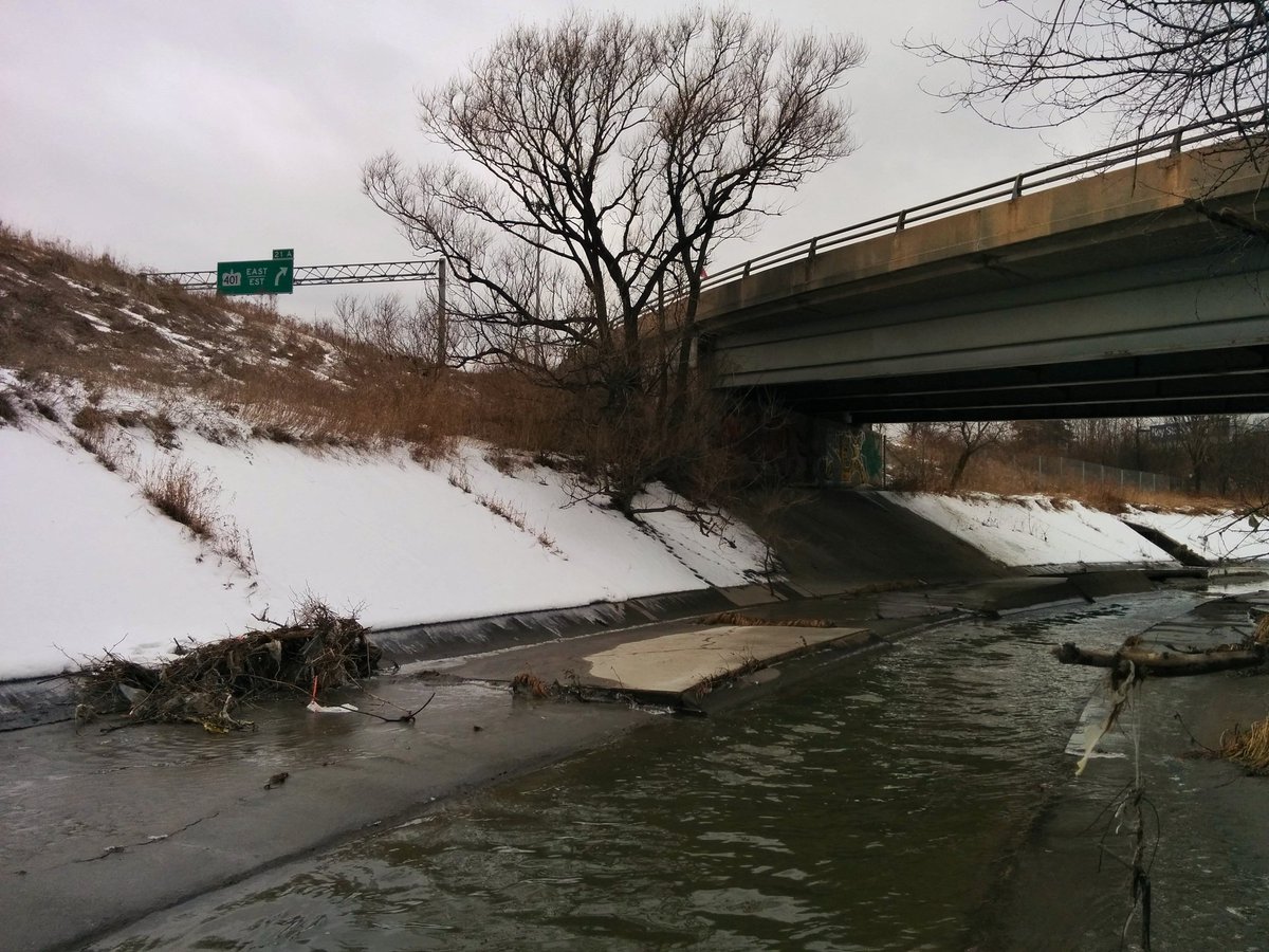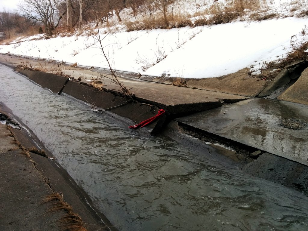 Back in the cut! Concrete channel returns, but this time, it’s not in the greatest shape. Heaving has occurred in some areas, and spalling down to the rebar in others.