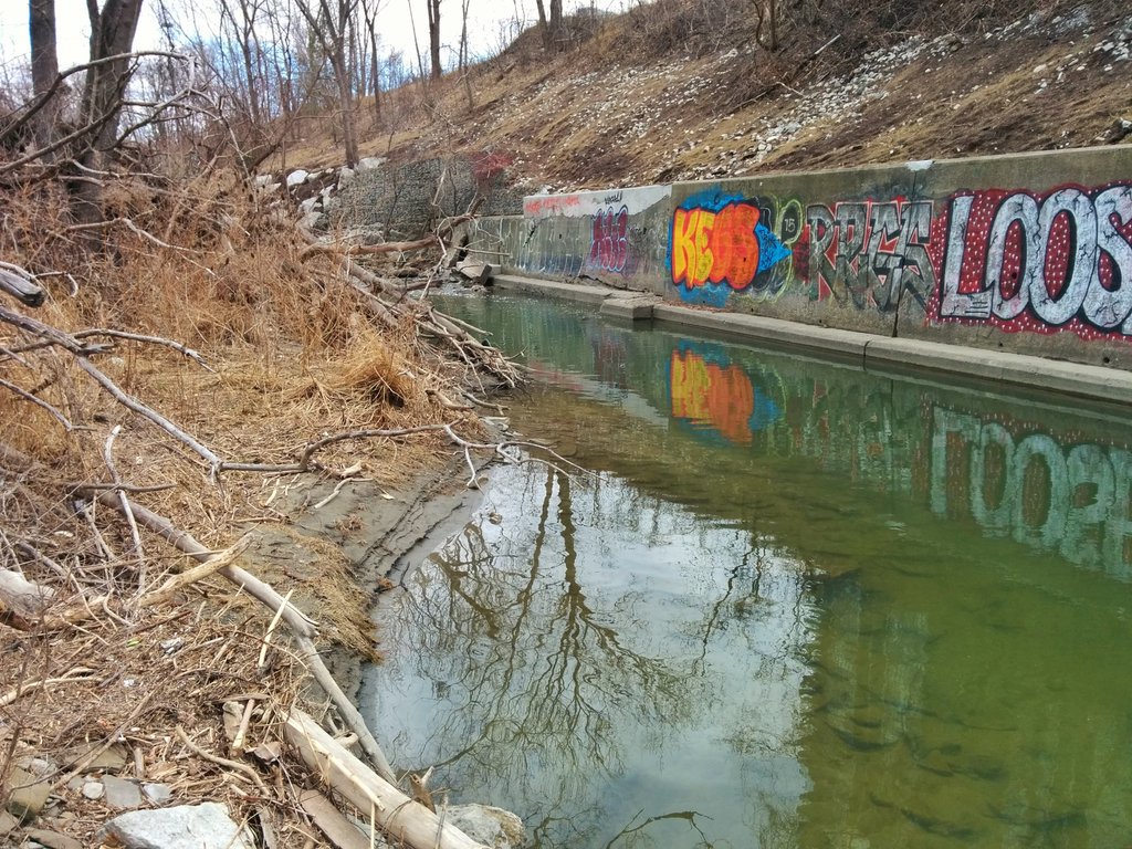 And here it is, folks. The first and only sign of Bonar Creek: its confluence with Mimico Creek.
