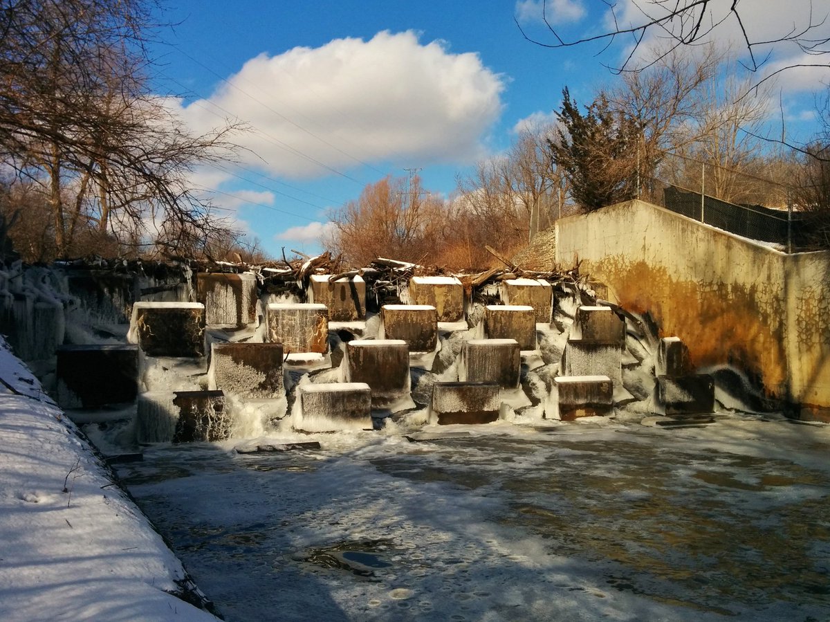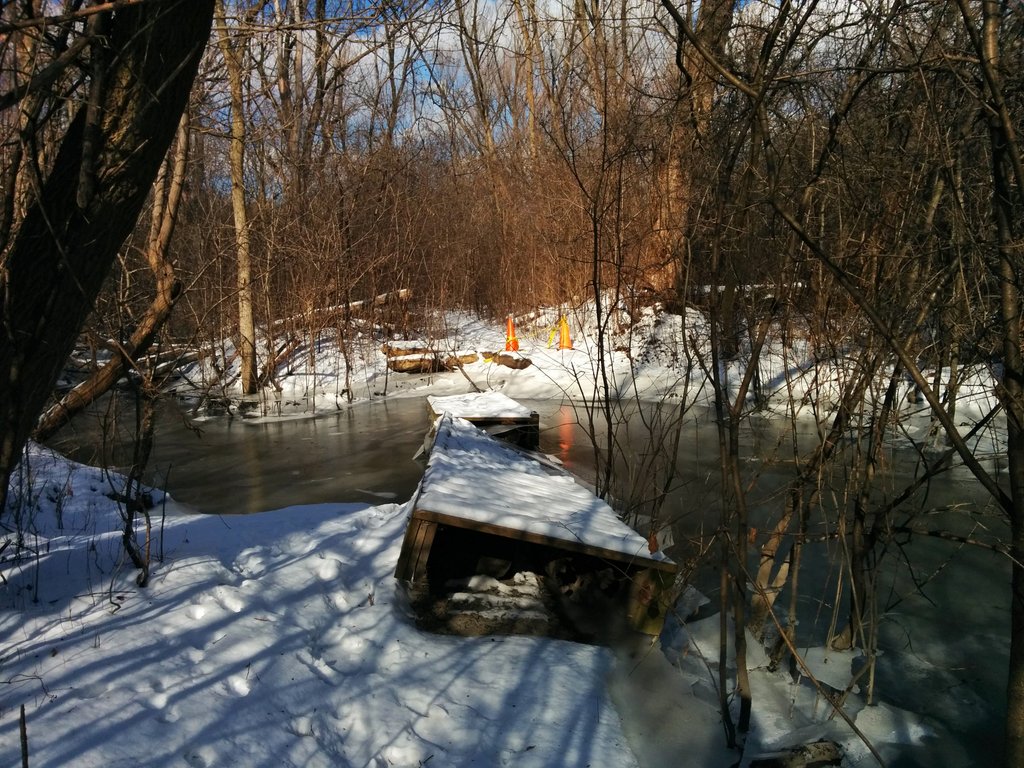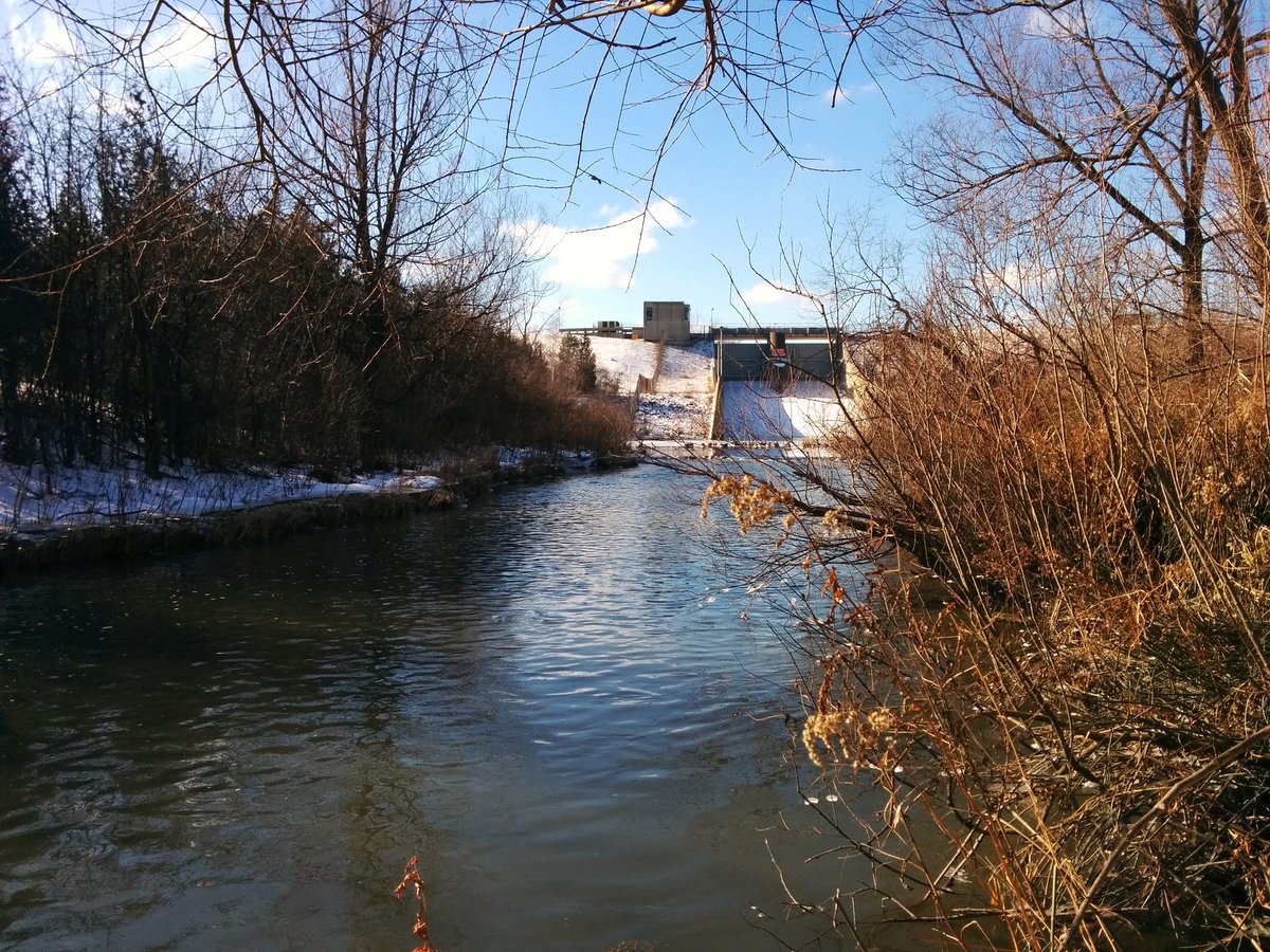 Through the Hinder Property to the Carscadden Greenbelt. The West Don is flowing strong, only tempered by a dam.