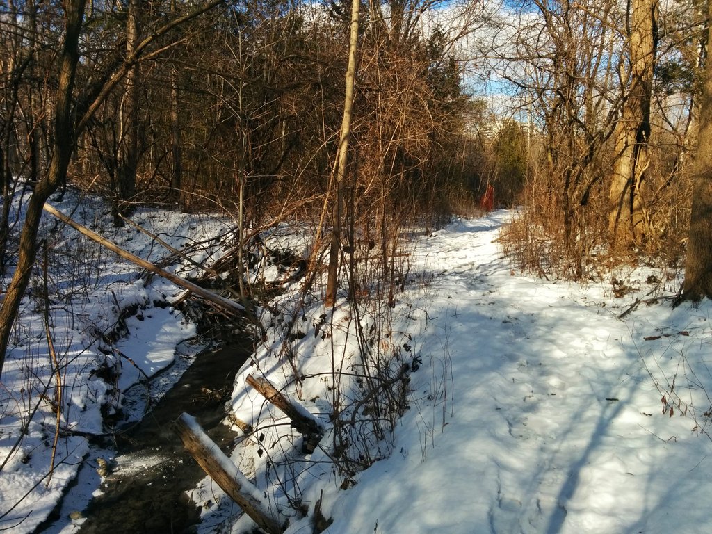 I went from a wide open golf course, to a road-trail, to this thick footpath. I welcome it. There’s no hint of city hum, aside from the slight din of air traffic. Chickadees are singing, ducks quacking, West Don gurgling.