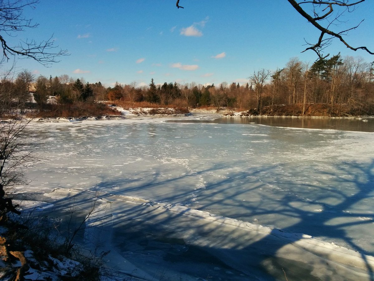 It’s a sunny winter morning. I’ll be going up the West Don, starting at Yonge Street. Well, not much of a start. There’s construction going on along the shore at Yonge and York Mills, before it goes into the Don Valley Golf Course.