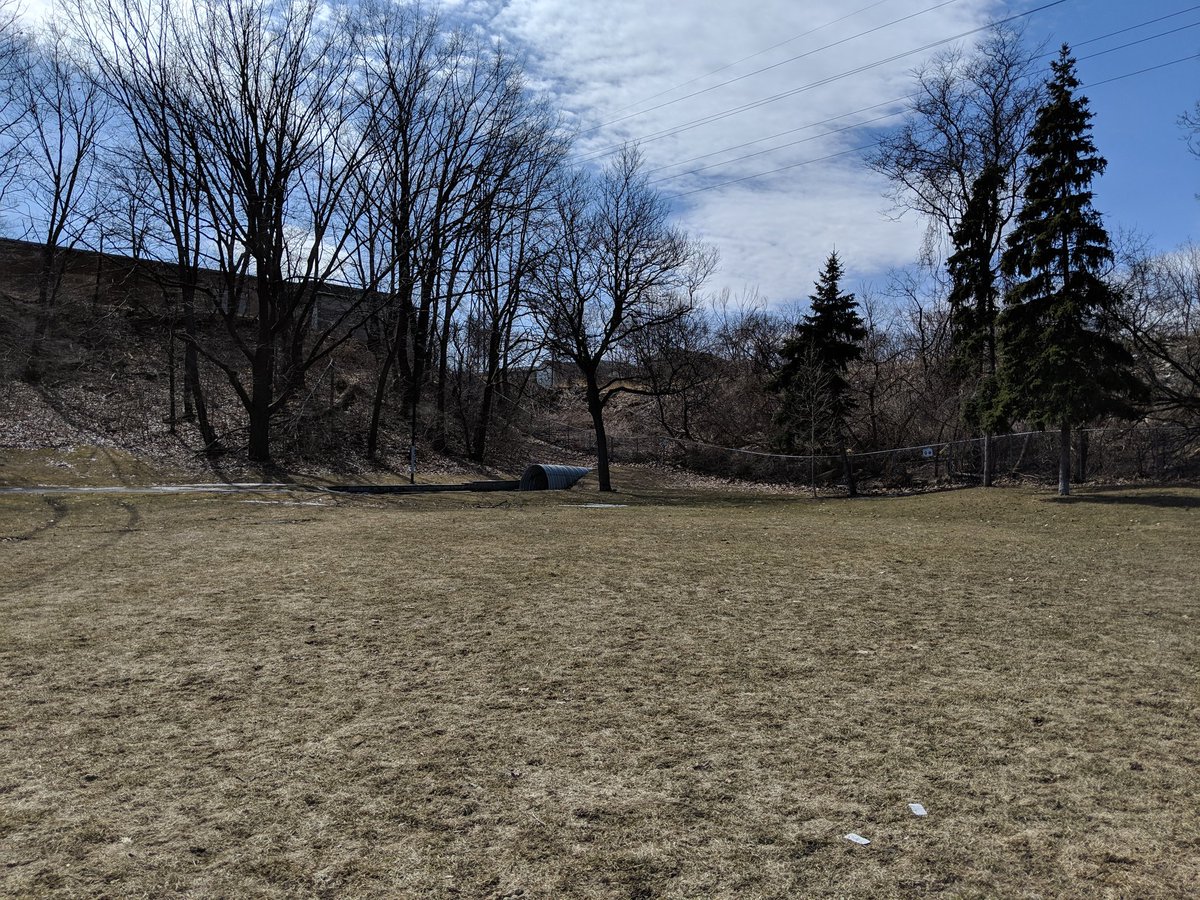 Next tributary is short too, north of the York Civic Centre, although it used to flow further east to at least Trethewey. A valley suddenly develops past the parking lot, it pops out and flows a hundred metres or so, then dives into a constructed outfall to Black Creek.