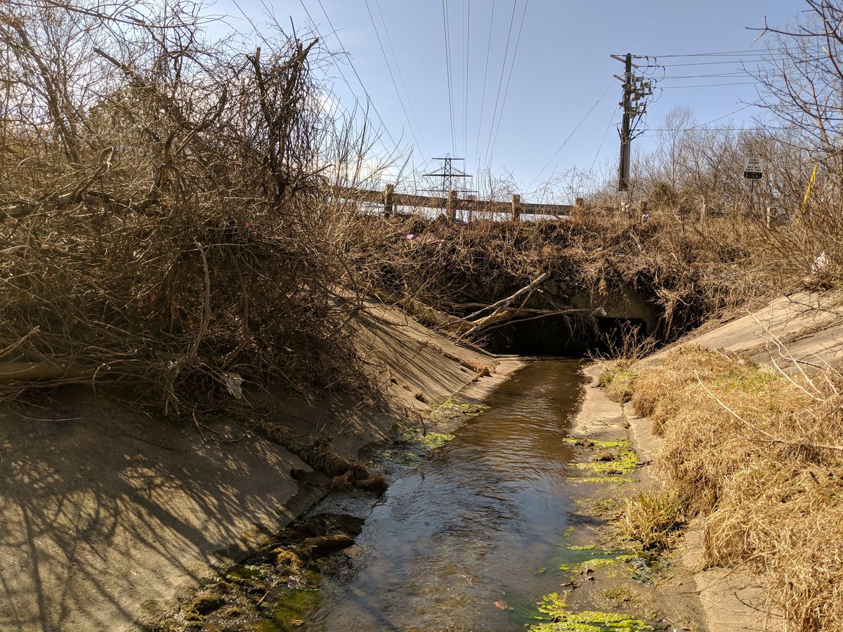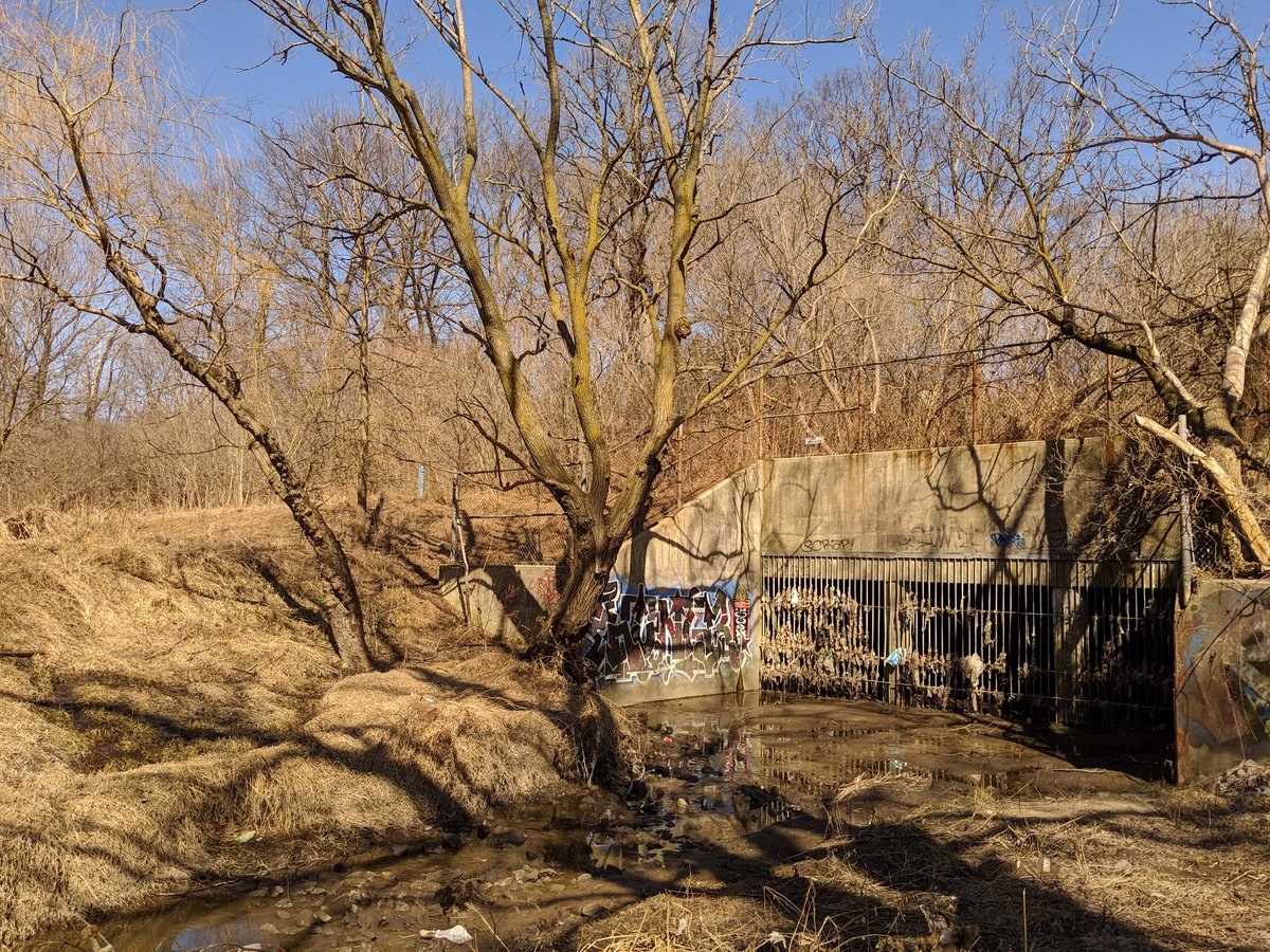Lavender Creek continues along the hydro corridor until Symes Road, where it ducks into another culvert. This one isn’t as long. The creek takes a 90° turn to the north, and punches under a couple old bridges to an adjacent industrial property.