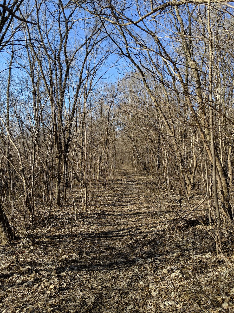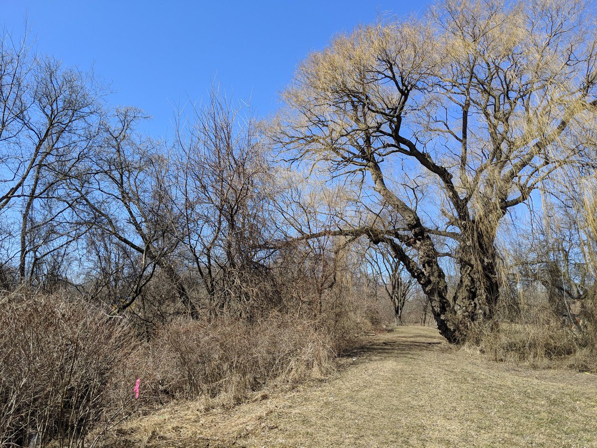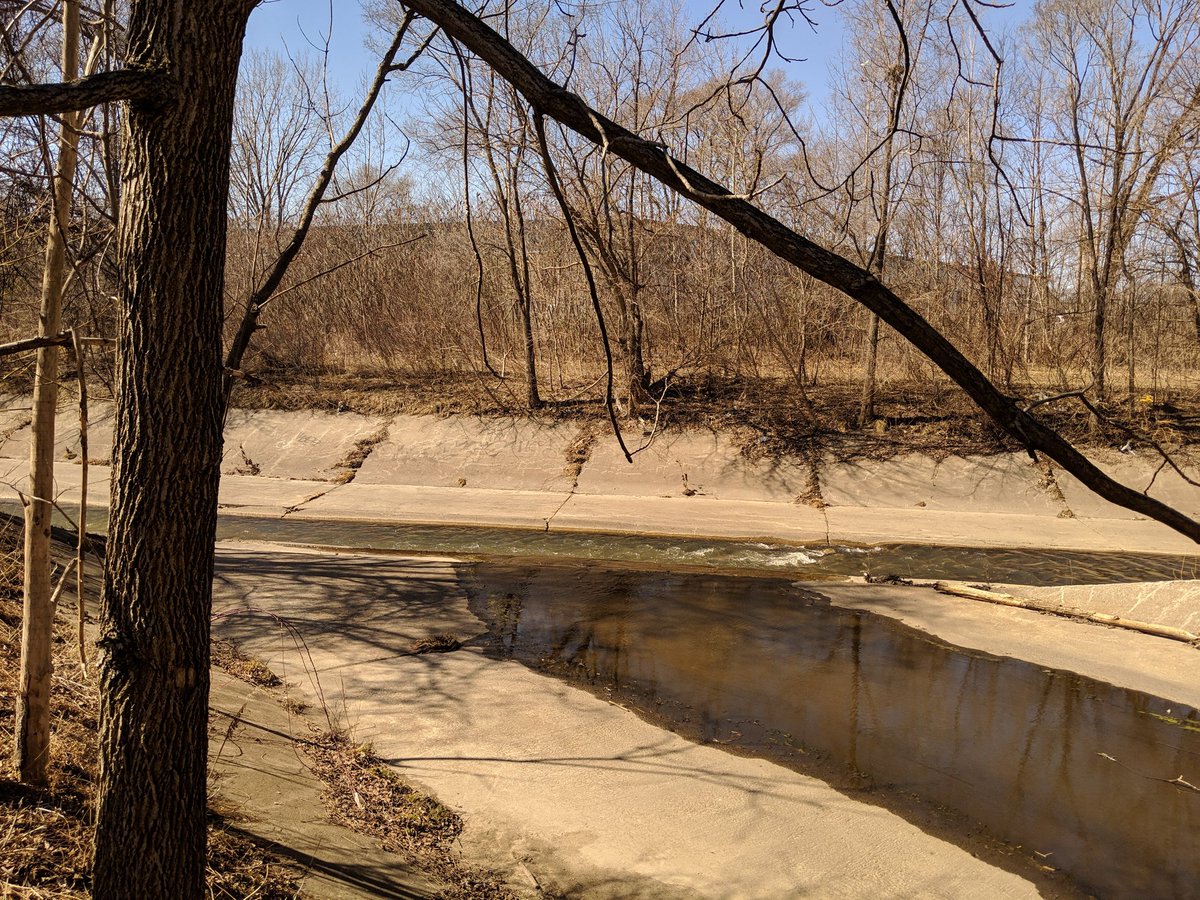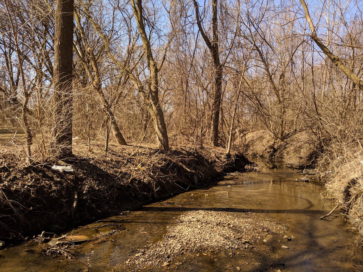 Symes Road ends. Parkland begins, leading you to Lavender Creek’s confluence with Black Creek. Pretty good spring flow, more than the last time I was down here, won’t be hopping side-to-side.