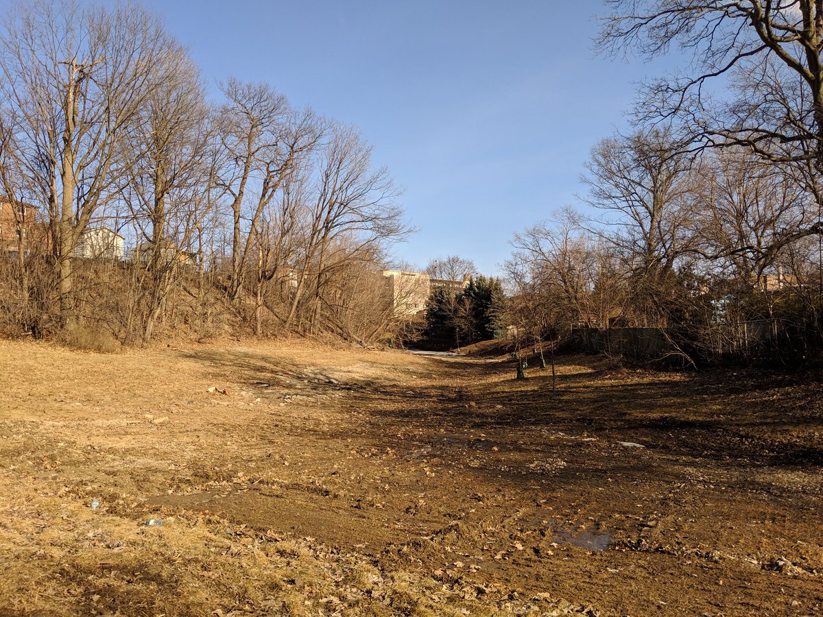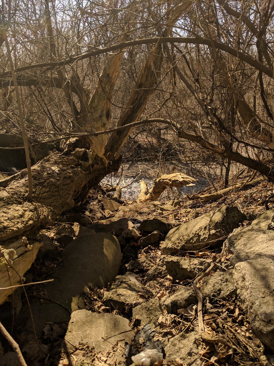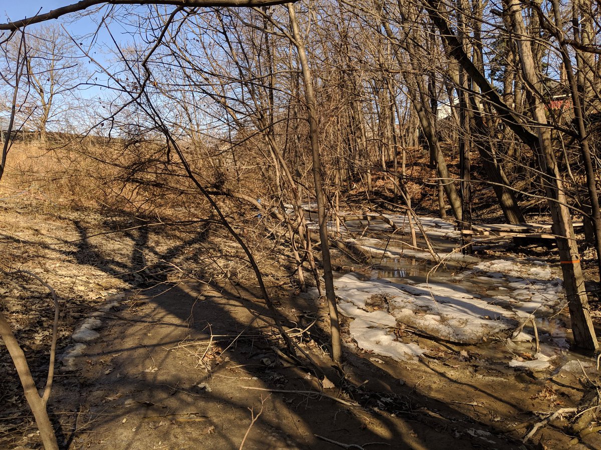 A drainage ditch and pumphouse in Charles Caccia Park. Sewers and leftover patches of ice in Prospect Cemetery. Only hints I got at the lost creek.