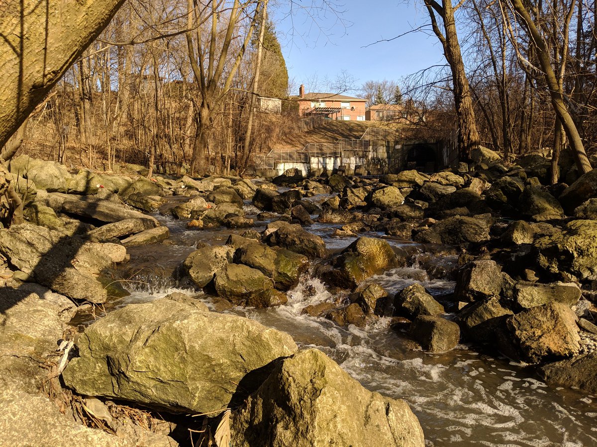 Finally, Lavender Creek appears here at the foot of Keele Street. There’s a short reach here flowing south to underneath the GO Kitchener / UP Express / CP MacTier corridor.
