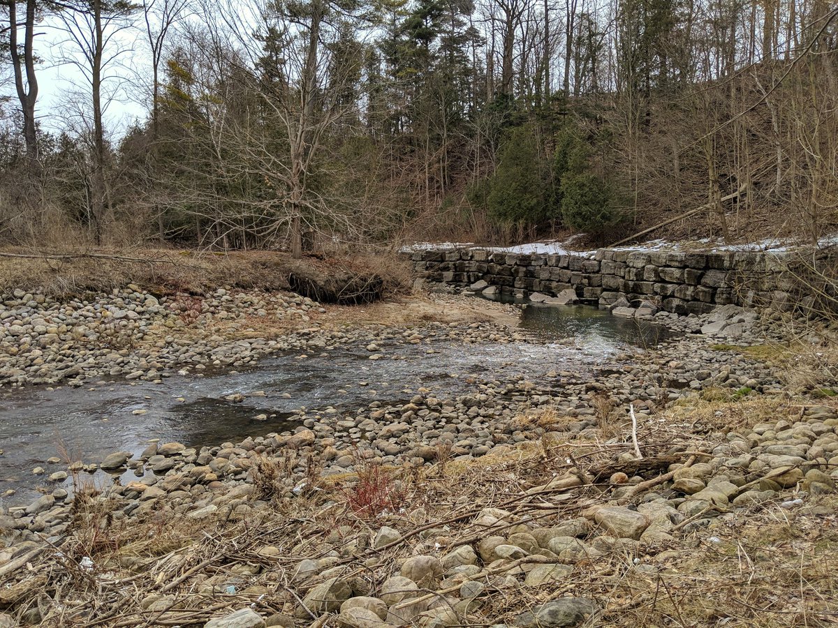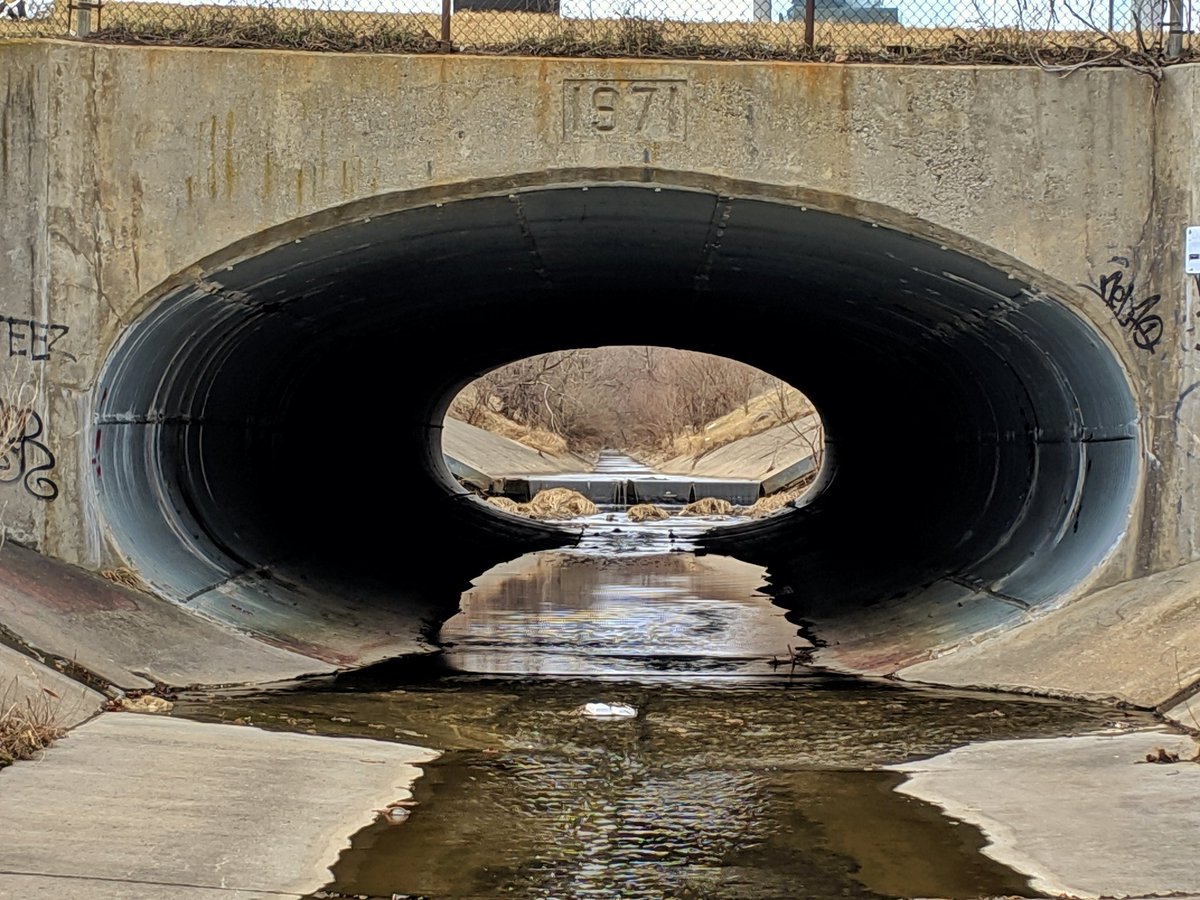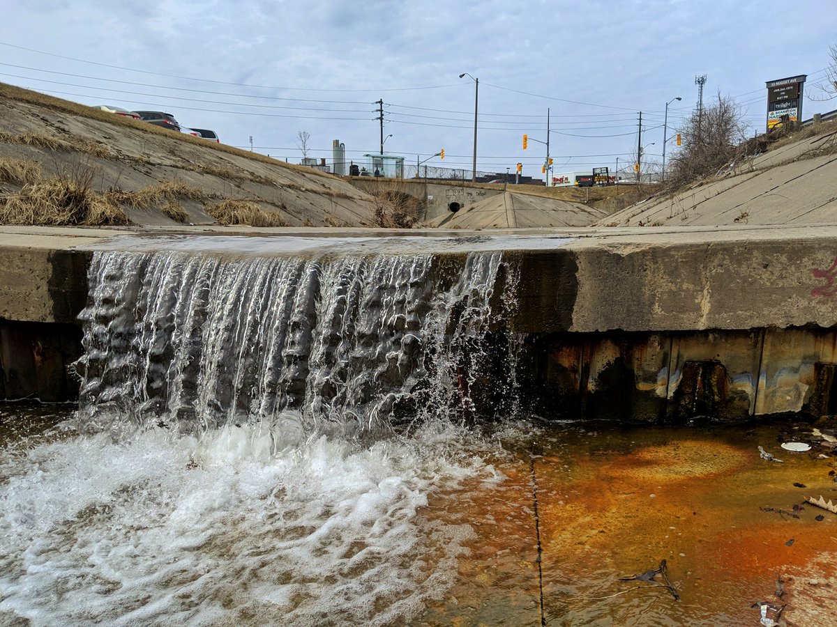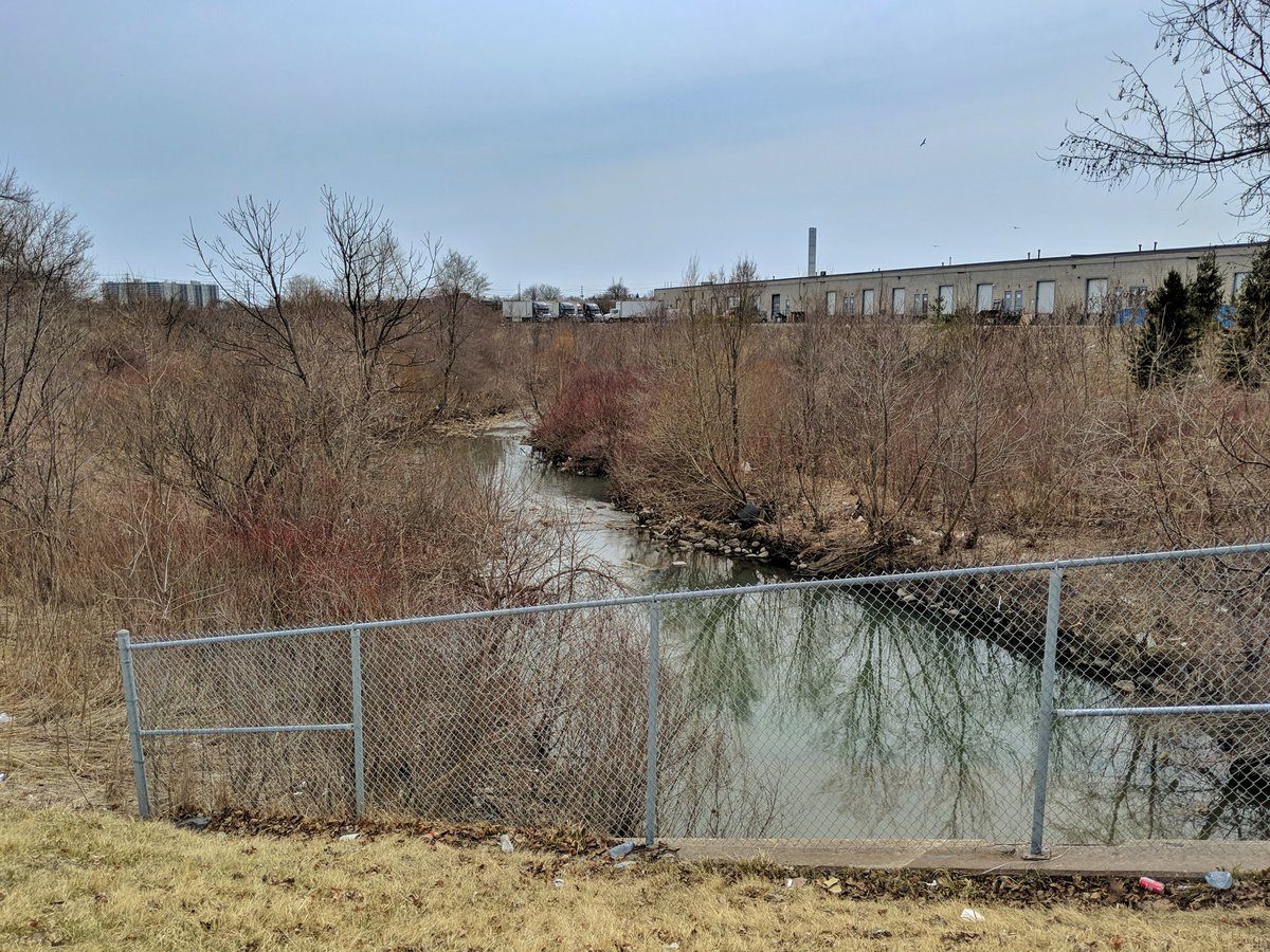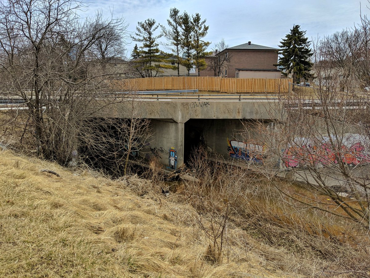 This trashy ribbon of nature turns north, and heads under the 401. Not going spelunking today.
