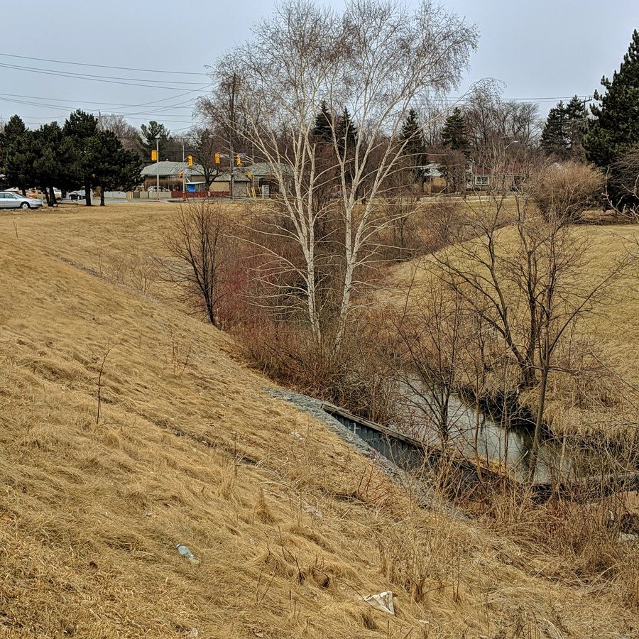 After the split, the creek channel narrows considerably, and the banks get steep. It ducks into a culvert to get beneath a huge railway delta that is the entrance to Canadian Pacific’s Toronto (Agincourt) Yard.