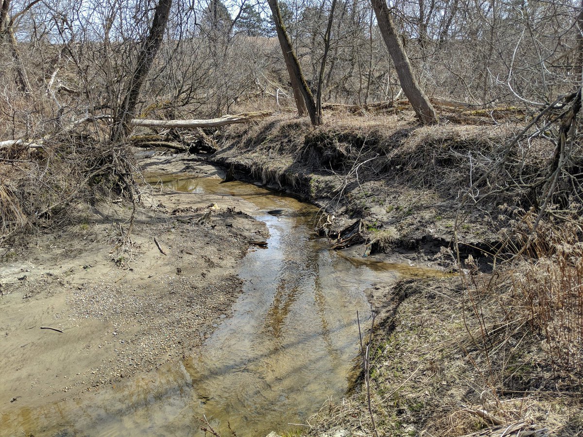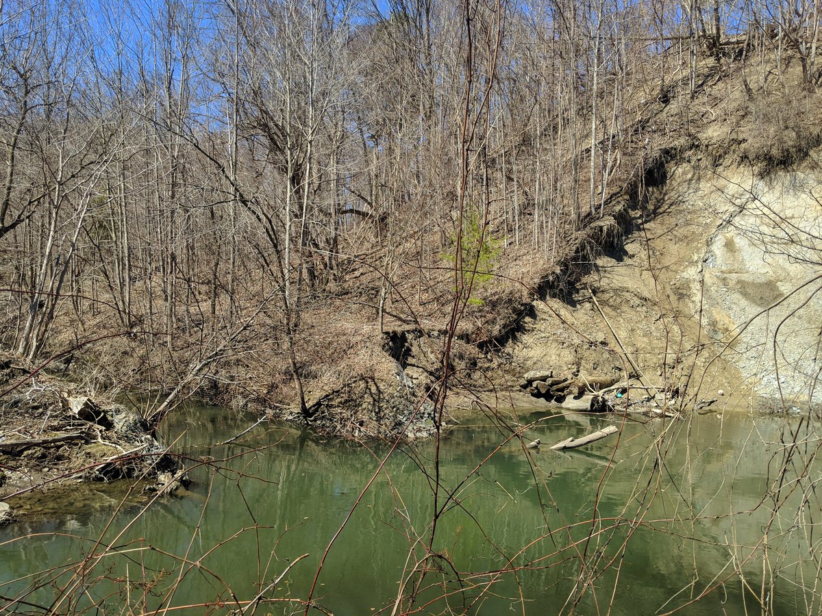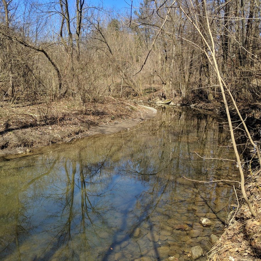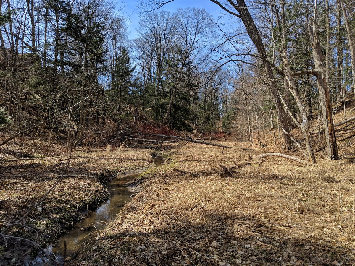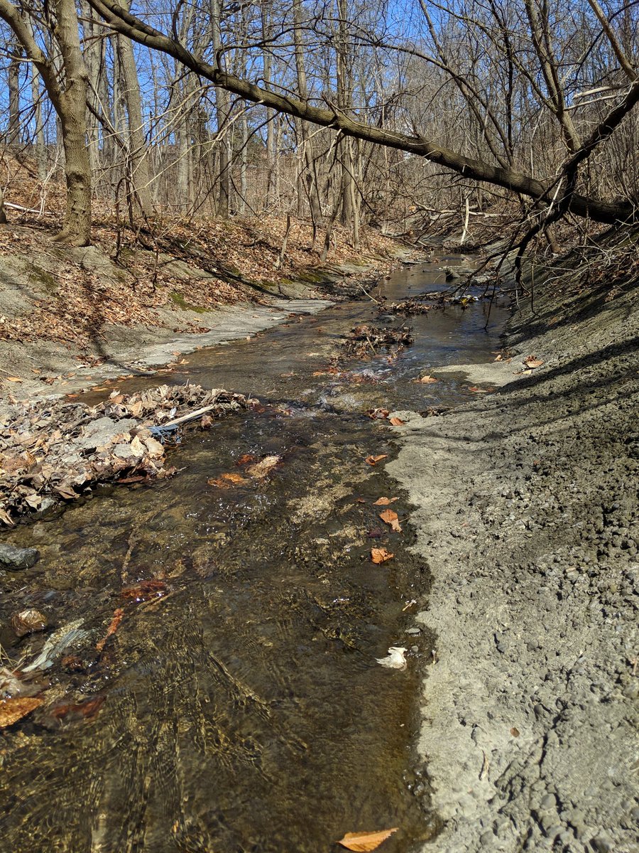 A glance up Highland Creek, then back to tributaries. This is a tributary of West Hill Creek, not far west of its confluence with Lower Highland. Deep channel, not a lot of flow. Some more beaten paths courtesy of some unspoken samaritan.