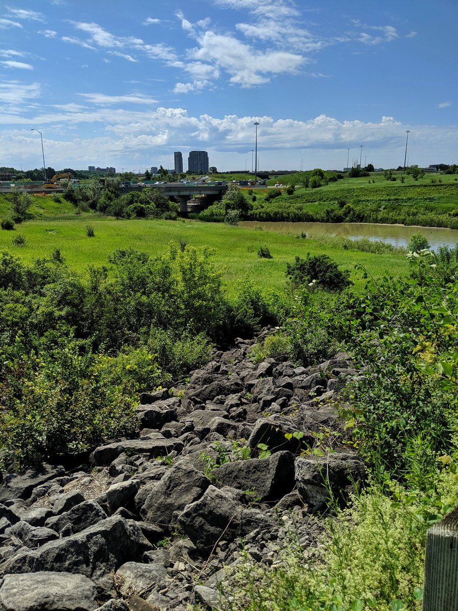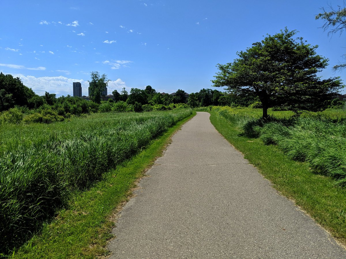 Through the hydro corridor, and past the Emery Creek stormwater ponds. Emery Creek may be subject to a future walk exploring some Humber tributaries. For for now, I march on. Despite some mature growth, it’s not in the right areas, so shade breaks are few.