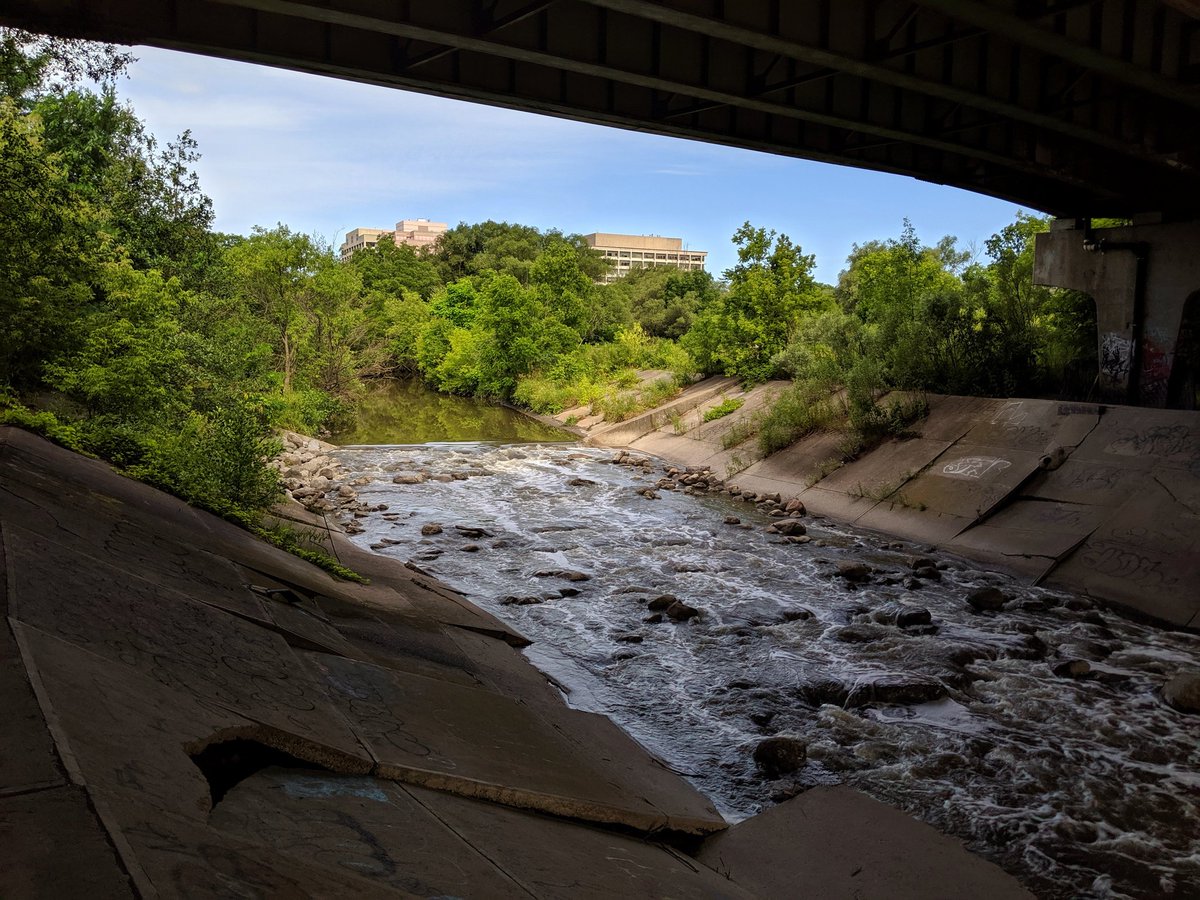 All of a sudden, the temperature drops 5°. Turns out to be air flowing out of an underground channel. Duncan Creek is lost just west of Don Mills, and there’s very few signs of it as you approach a local public school.