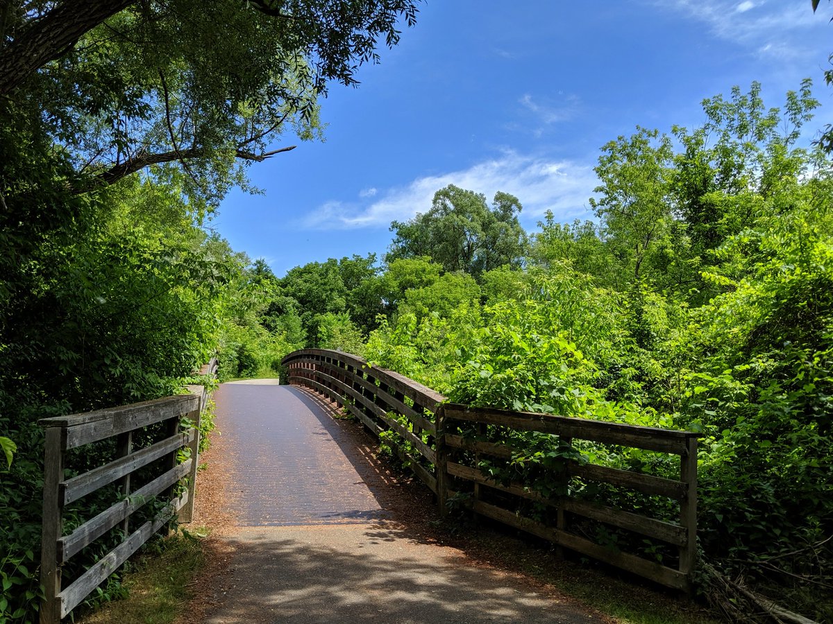 A bit of trudging through dirt and grass, and then a formal trail. Vegetation is thick and lush from last night’s rain. Good wooden bridges to start.