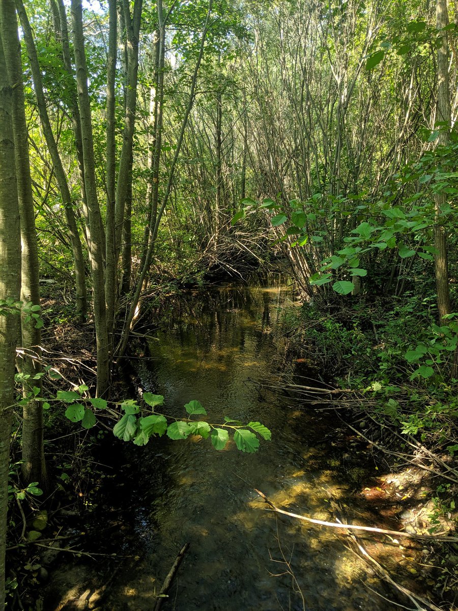 Moffat Creek starts somewhere in Puslinch I believe. It enters Cambridge, and your first urban glimpse may be at the end of Wesley Boulevard. I didn’t push through the bush to see it, just followed along stormwater ponds until a bridge crossing near Dundas.