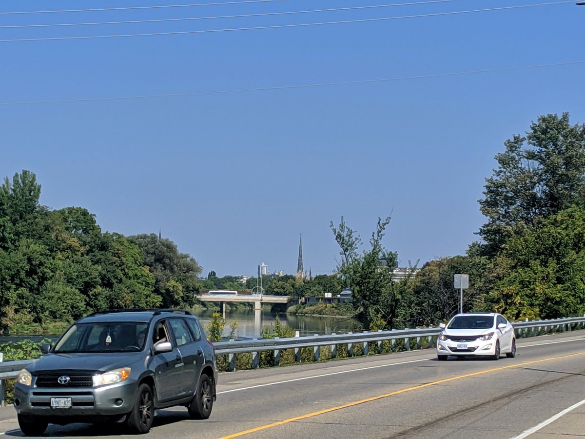 Broken mill. And one last glimpse downstream before it meets the Grand. No view of the confluence due to a tent camp. Heading back the Paris-Cambridge Rail Trail back to downtown Galt.
