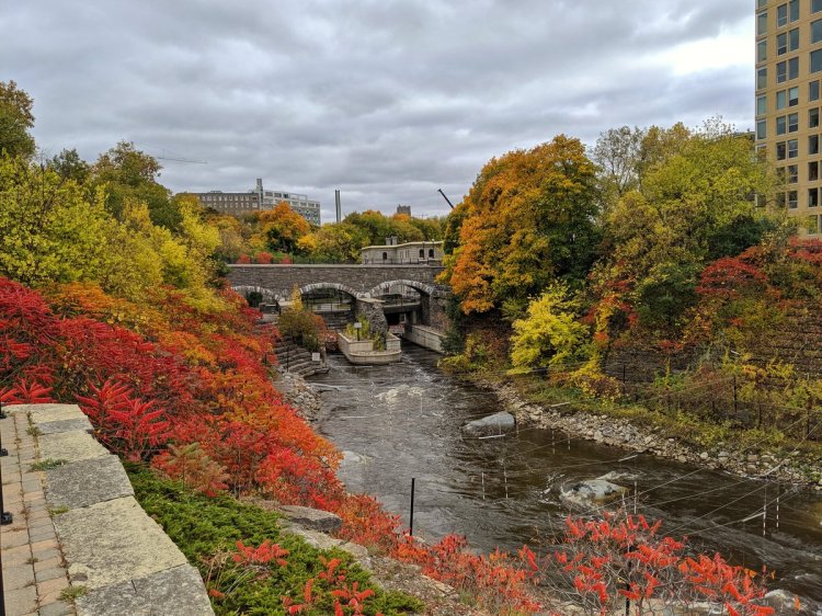 The creek meanders through a heritage area of Doon. Under two historical bridges and into a greenway.
