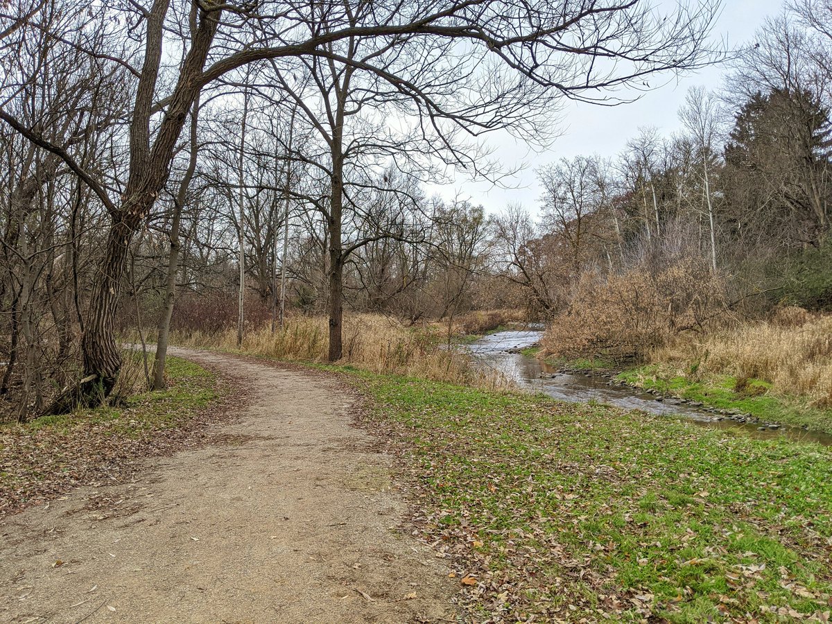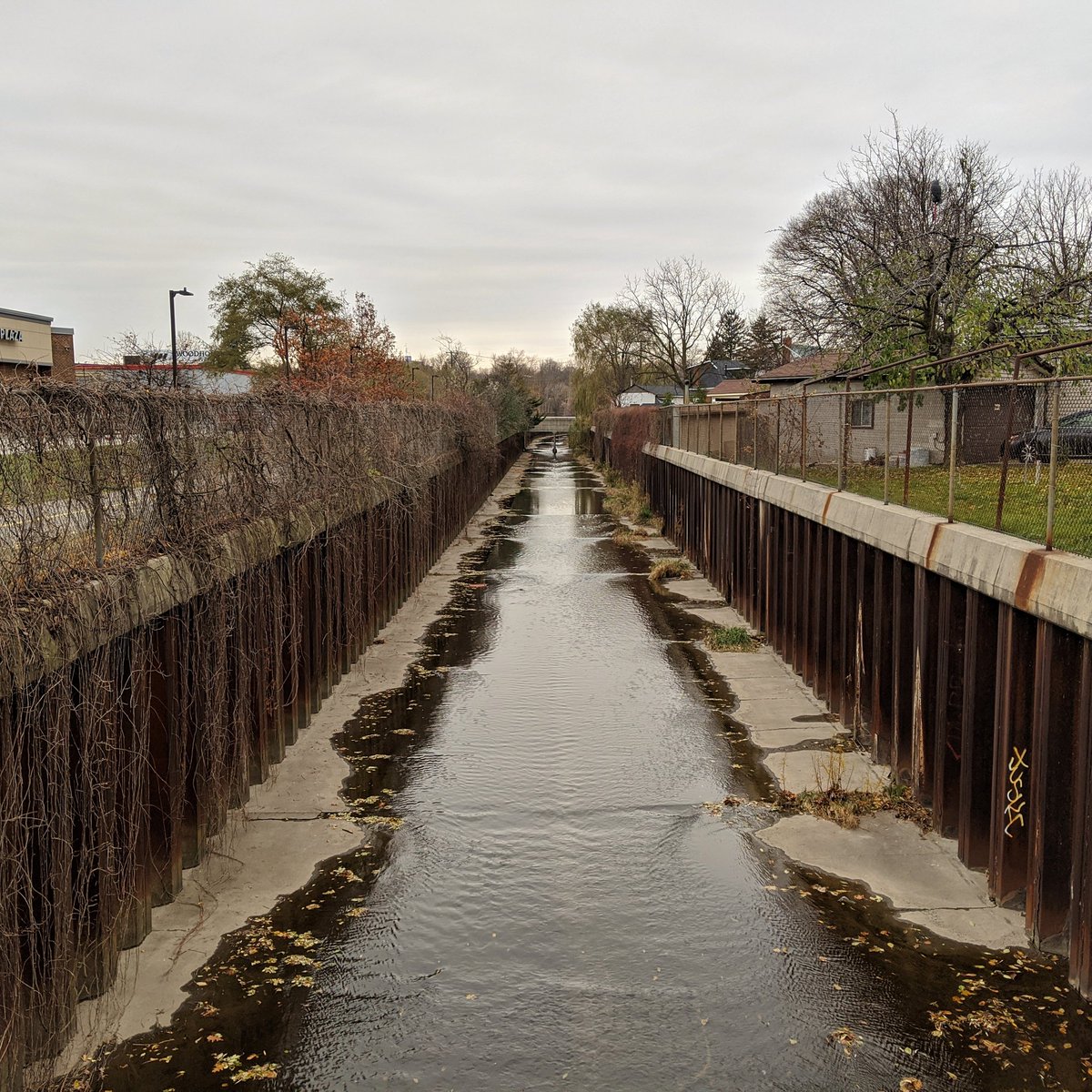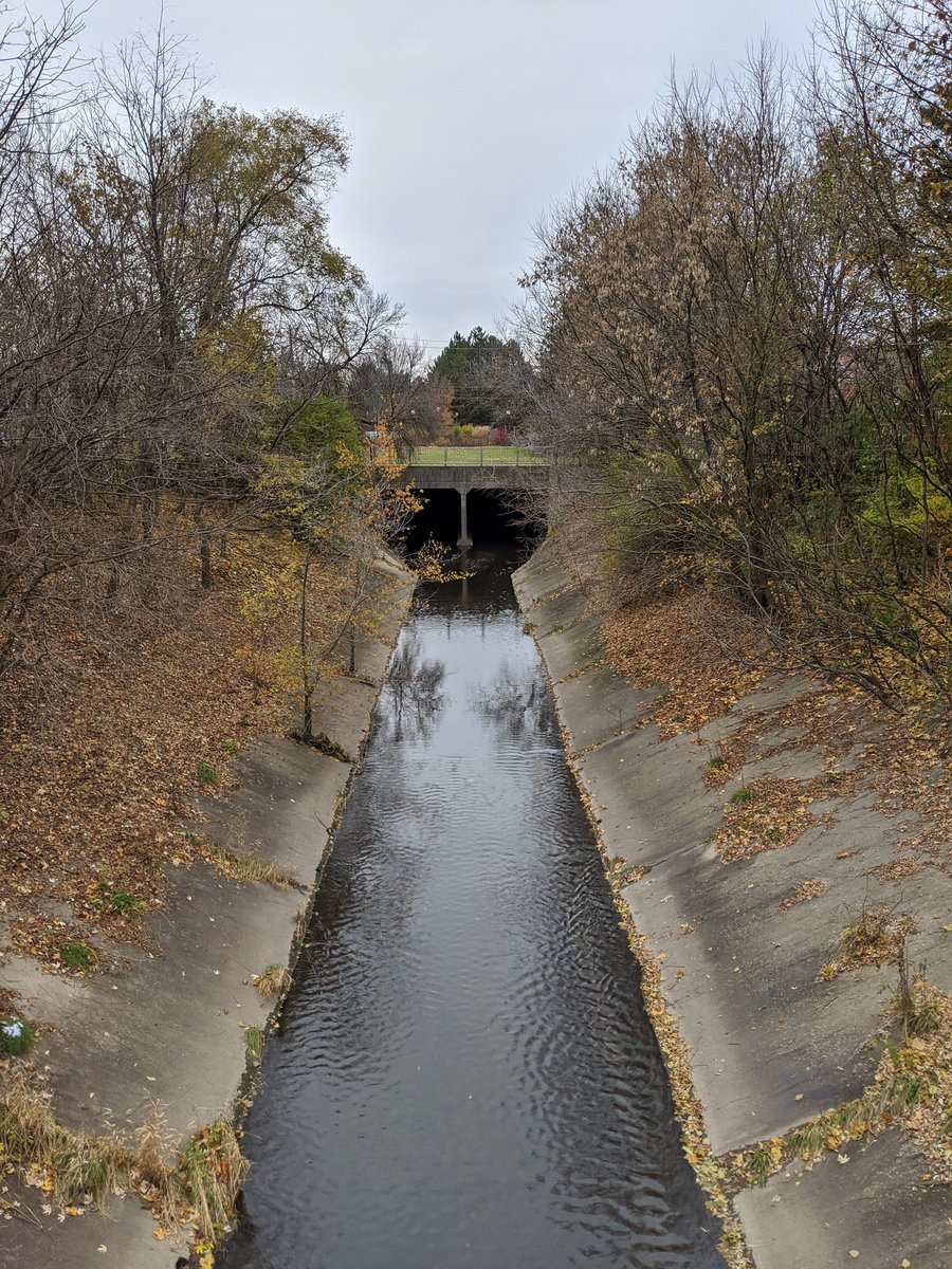 Despite the creek being channelized, there is a half decent trail. A plaque also tells me that this reach was buried in an underground conduit until some homes were expropriated in the 1980s, and the creek was daylighted to ease flooding.