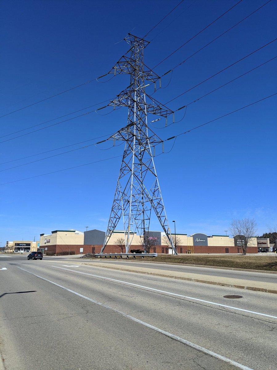 The hydro corridor bends through a commercial shopping plaza and a highway interchange before connecting to the Preston Transformer Station, west of Hespeler Road. This is where we end today’s walk.