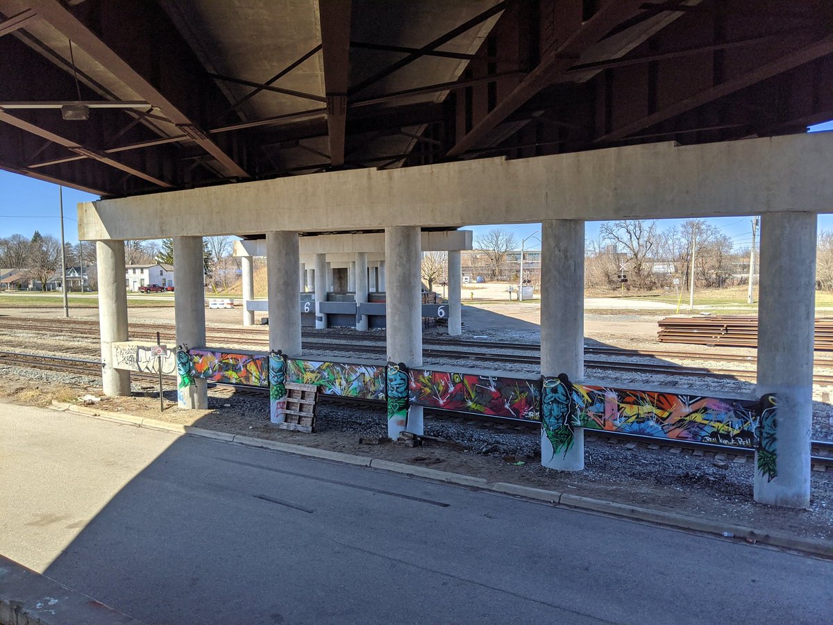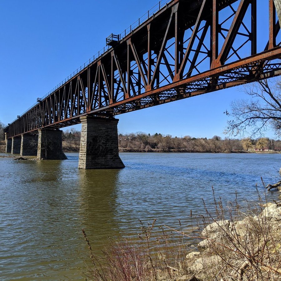 The massive bridge over the Grand. West of the river, trains do an S-bend before heading out of town. This marks the end of this (relatively) short walk.