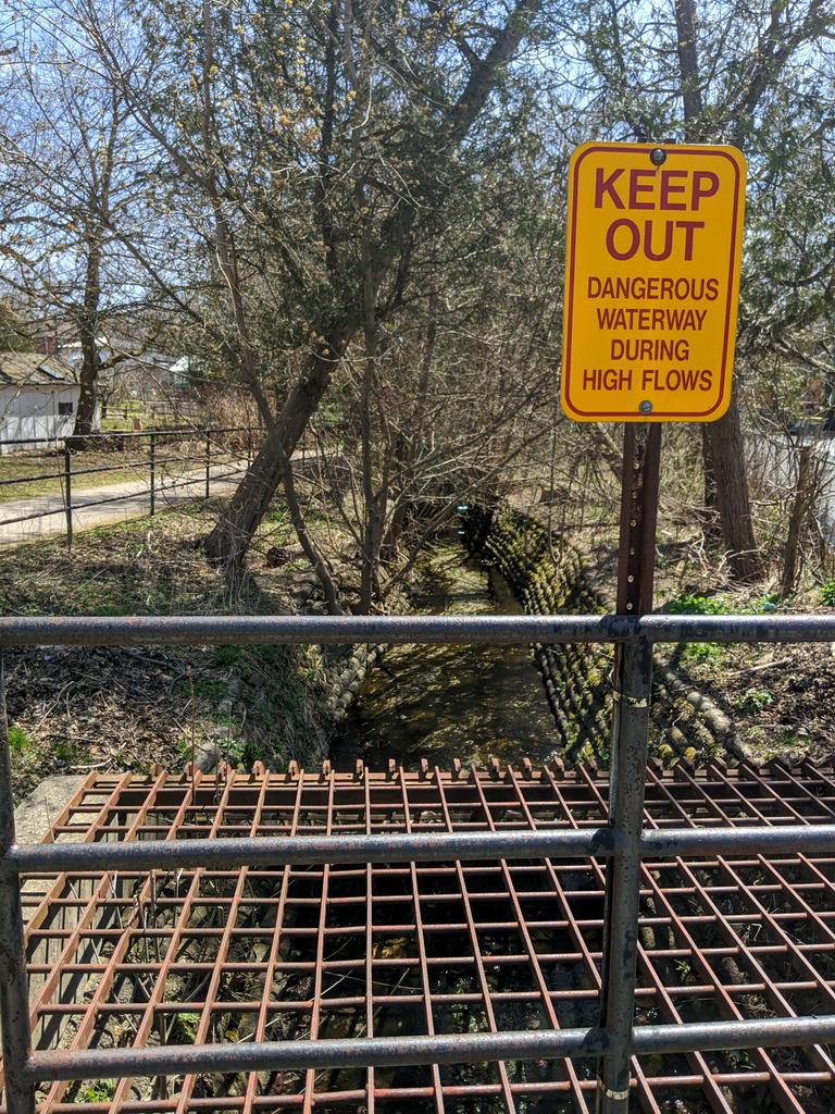 Wasn’t too confident there was a watercourse to see, appeared to be an old remnant footbridge from long ago. But this suddenly appeared south of Forbes Street. Skinny, with tall banks of…stones? They look more like cement sand bags.
