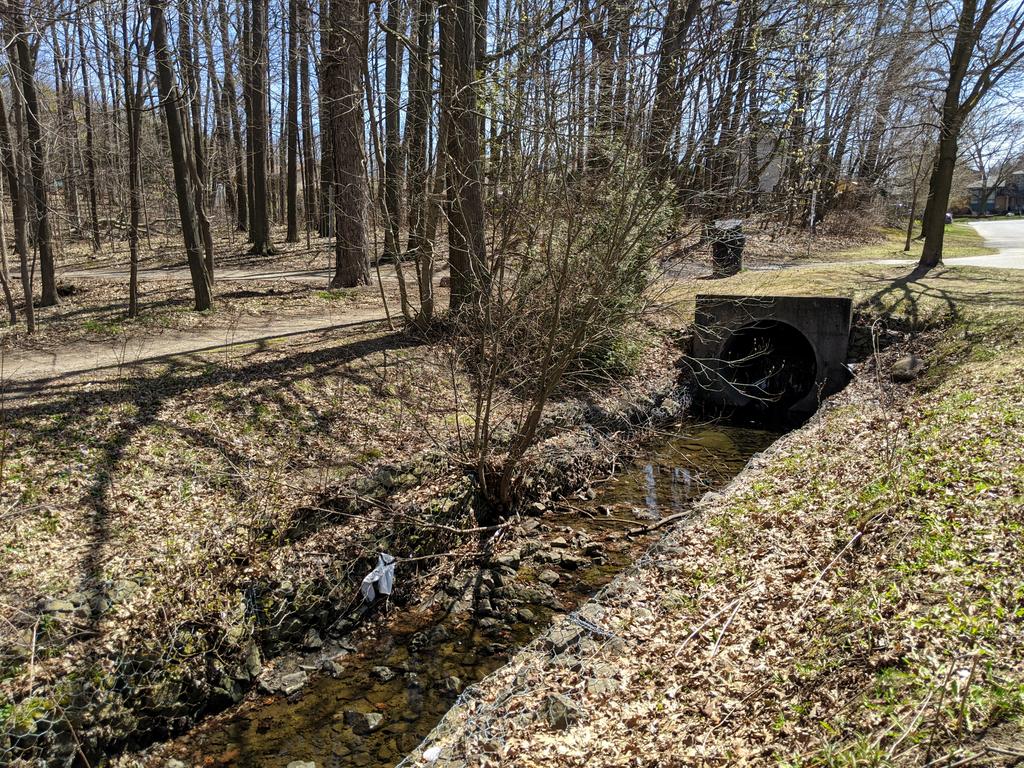 Nice trail system, but the lack of substantial rainfall this spring has left the wetlands and the forest pretty dry. No watercourse to be seen, only a stormwater pond has some standing water in it.