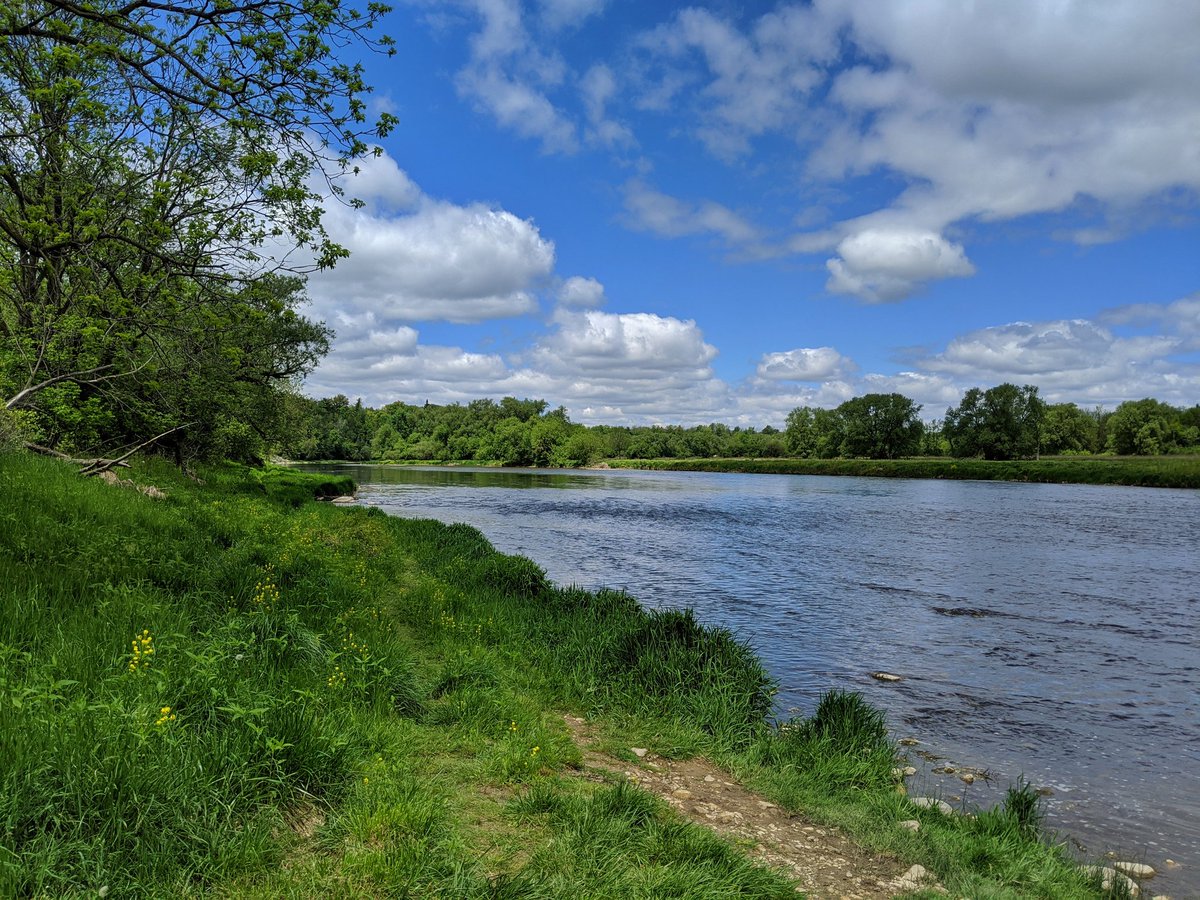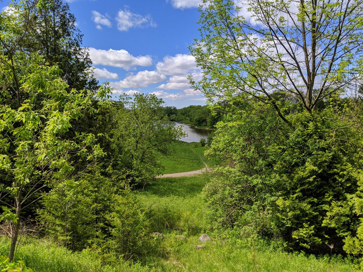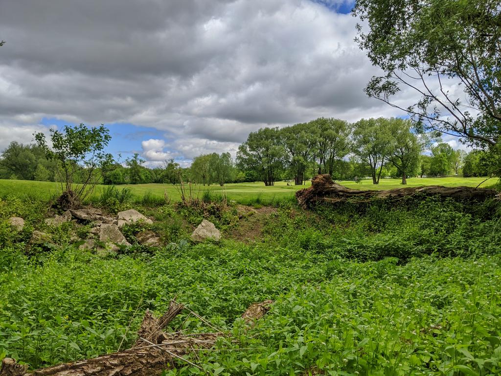 Back down into the valley. There’s another golf course here, but the riverbank remains public property, and the trail is in thick old forest growth. This is plenty fine, just wish we could do the same downstream.