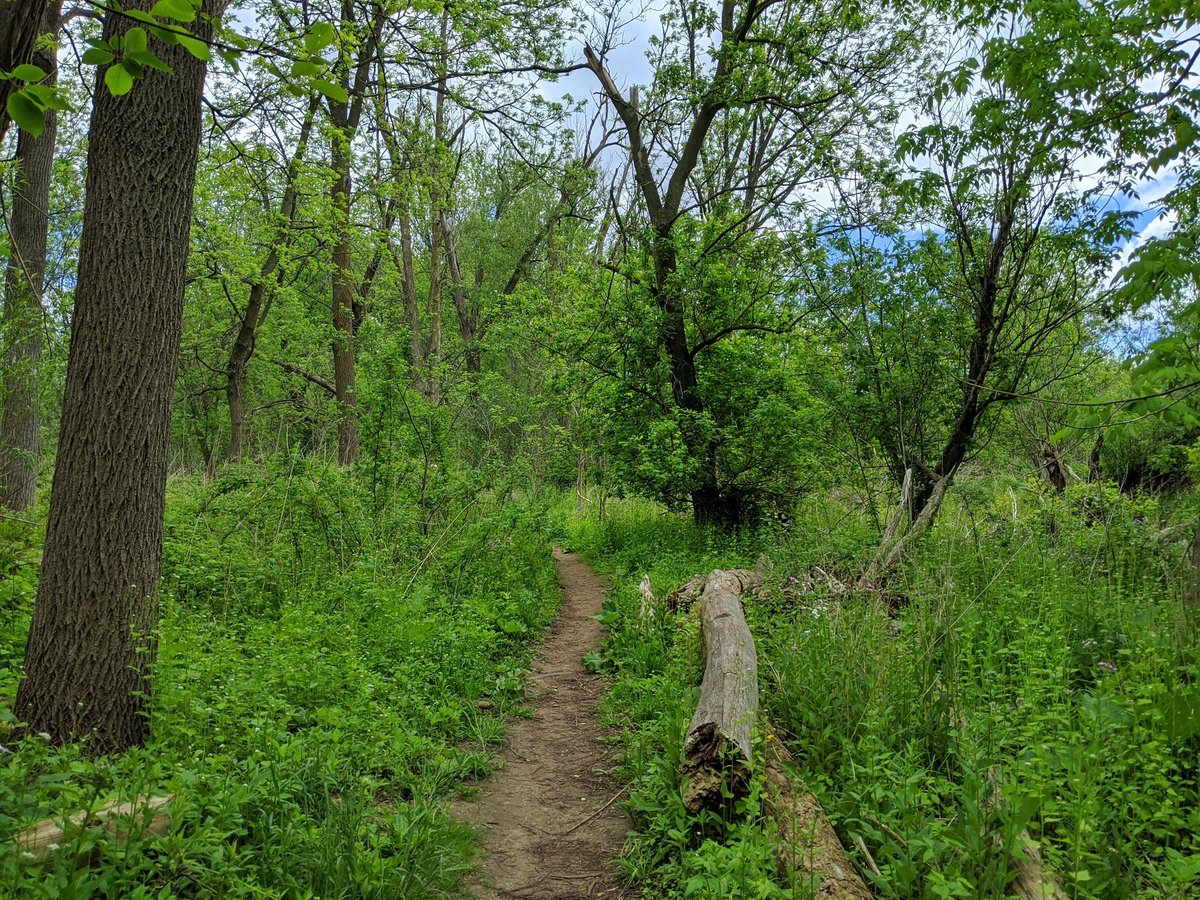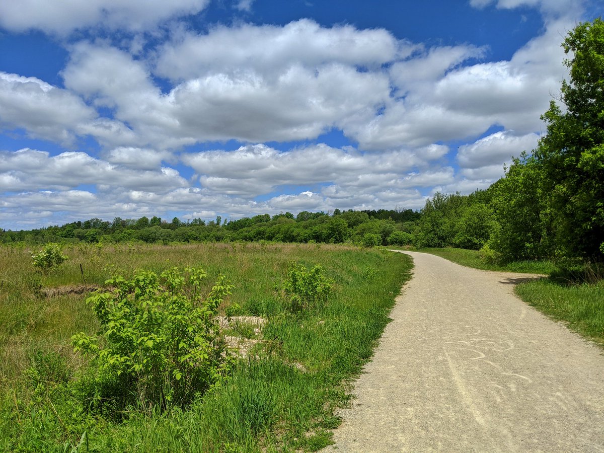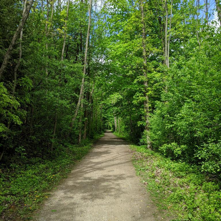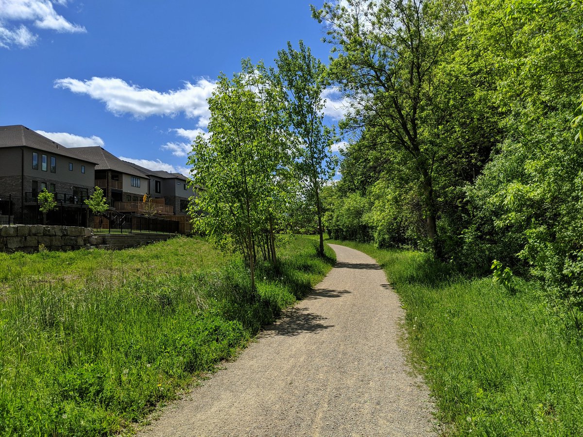 A long switchback to a peak, and a steady decline back down. We’re on the border between Kitchener and Breslau, so still stellar quality valleylands, with the odd drone of air traffic from Waterloo Airport.