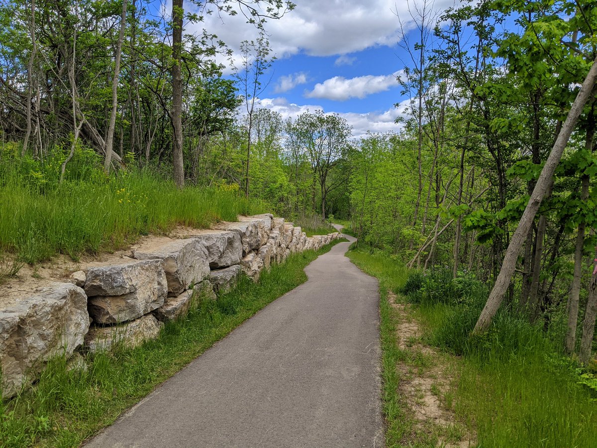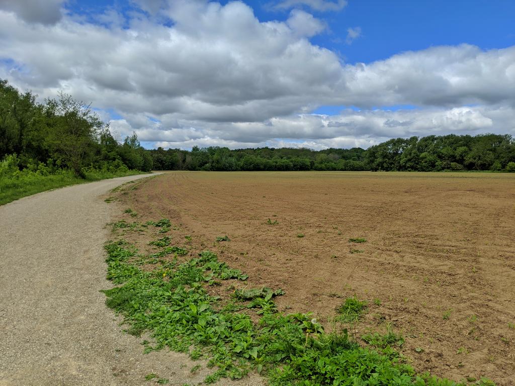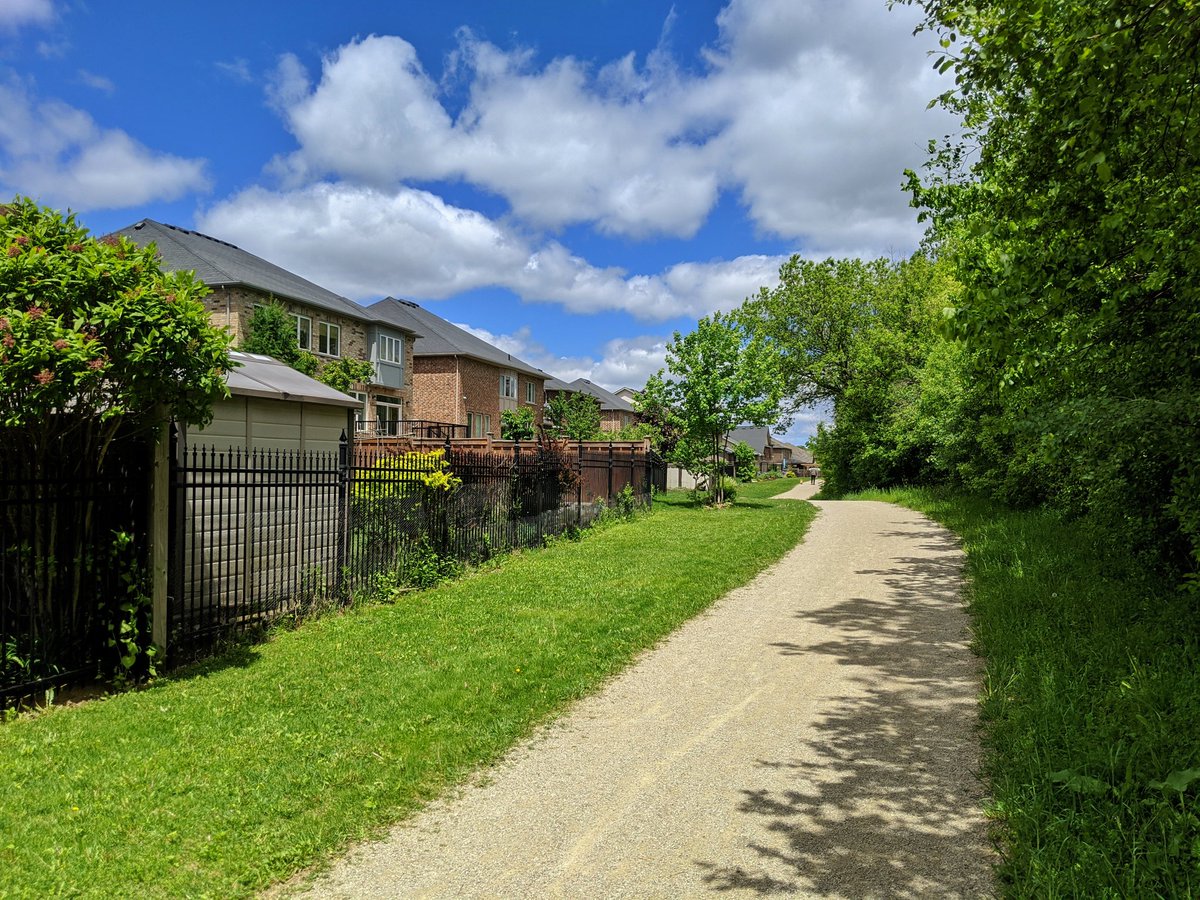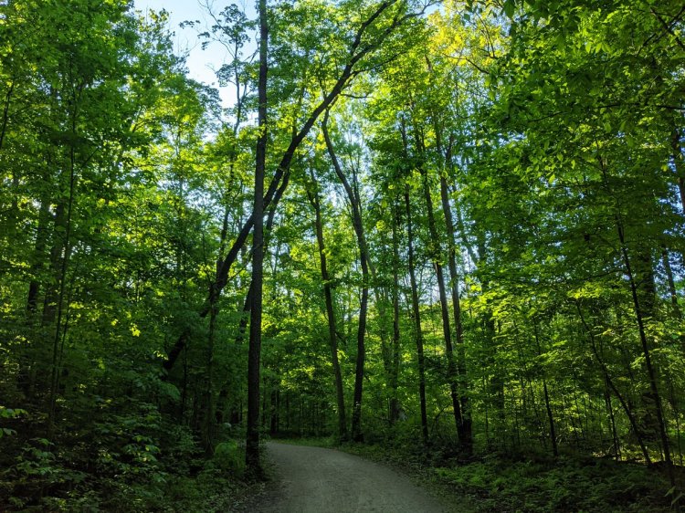 A long switchback to a peak, and a steady decline back down. We’re on the border between Kitchener and Breslau, so still stellar quality valleylands, with the odd drone of air traffic from Waterloo Airport.