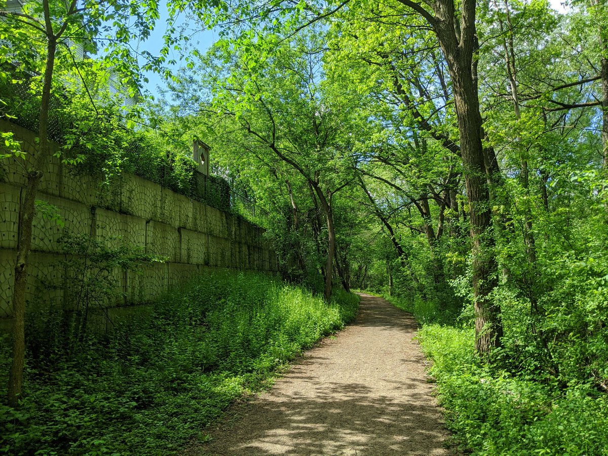 A relatively new trail leads across a small tributary, Idlewood Creek, which recently underwent a revitalization. Then wide stonedust trails resume underneath and east of the massive Fairway Road bridge.