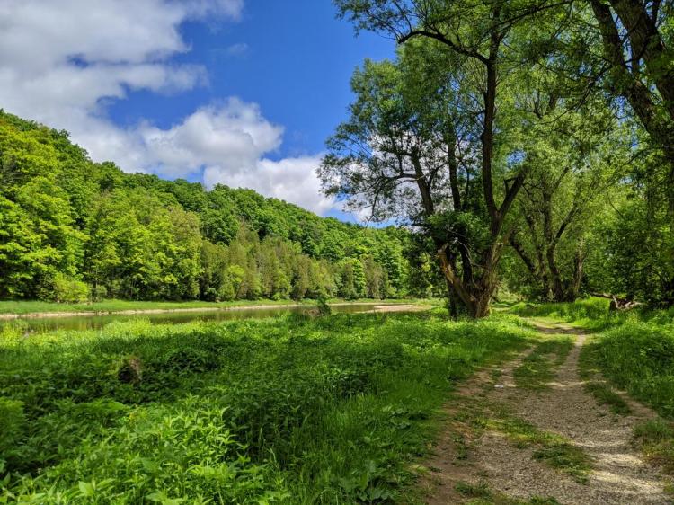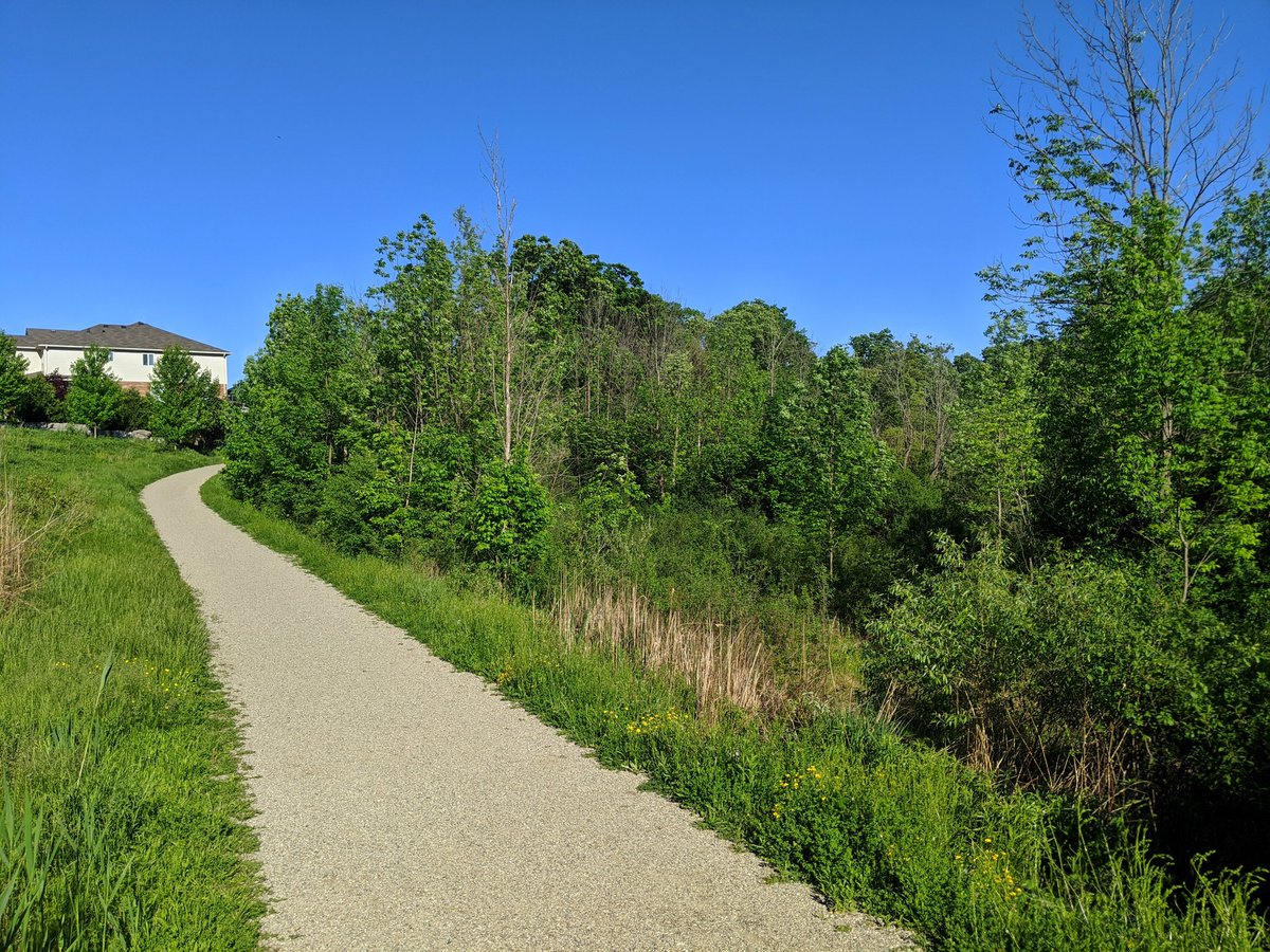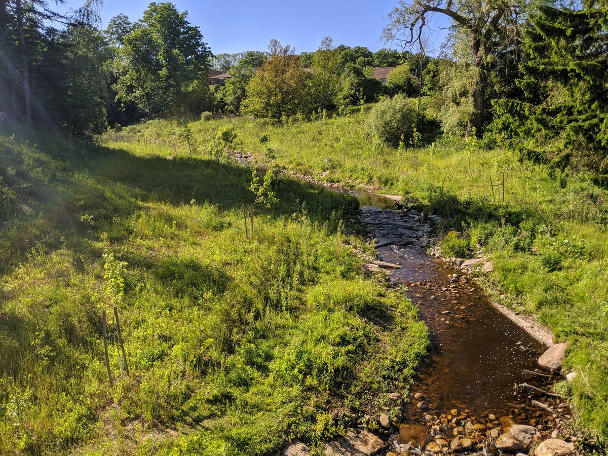 Trails along the lower reach of the creek are the product of newer subdivisions. Houses up on the tablelands, trails set back from wetlands in the lower riparian zone.