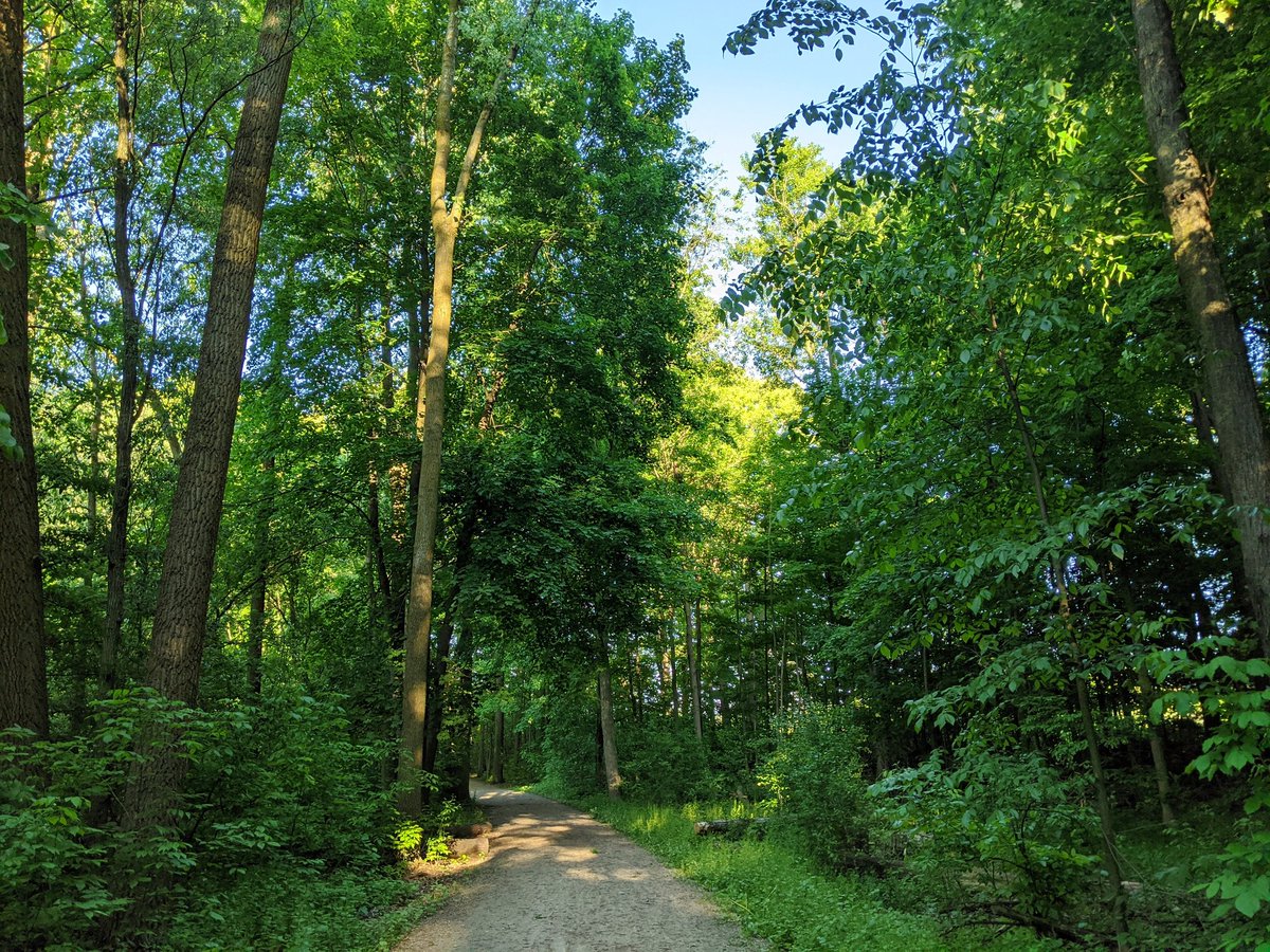 Back again. Across, and eventually in parallel with the creek. Forests get thick, trees tower above the trail.