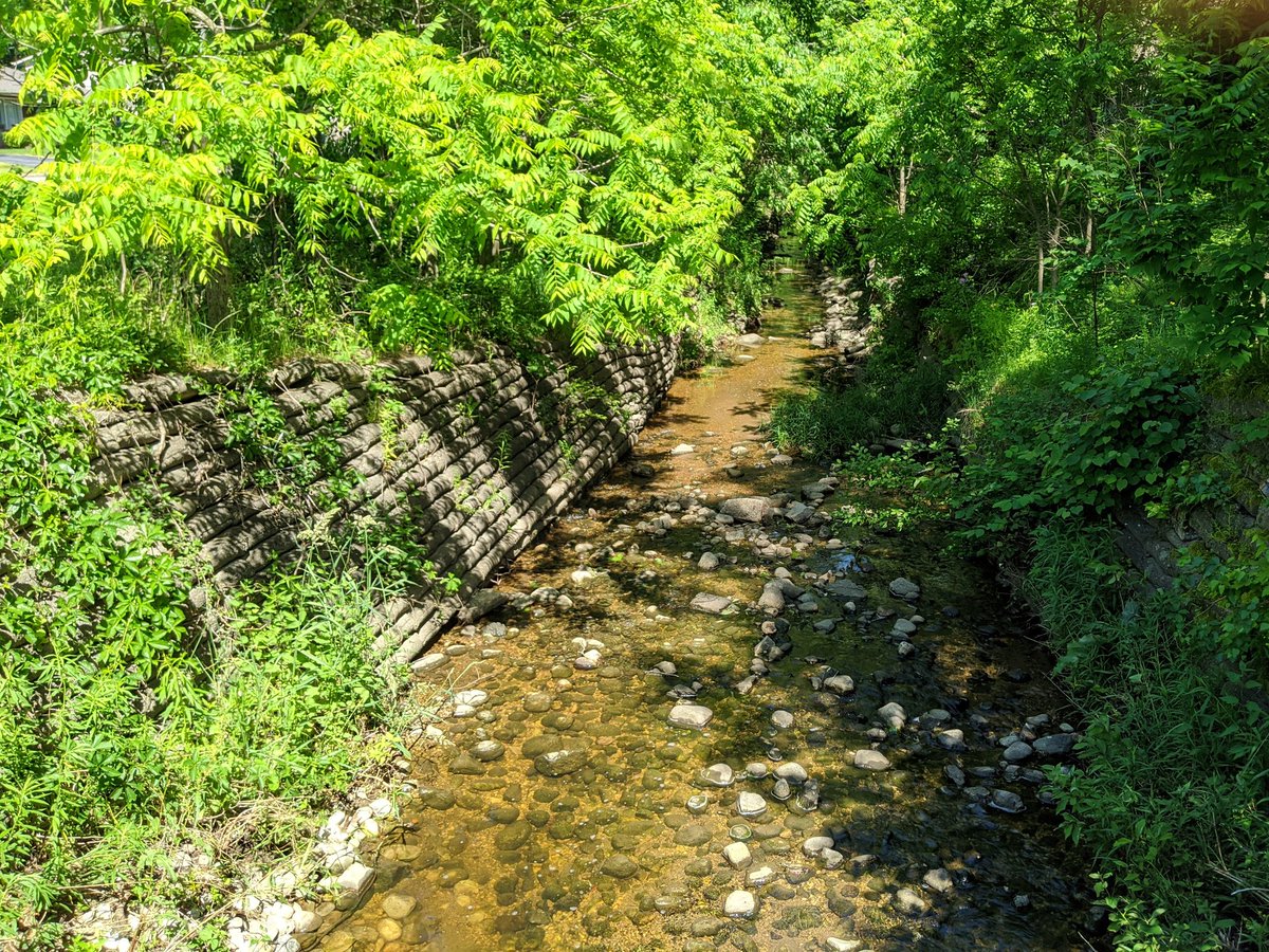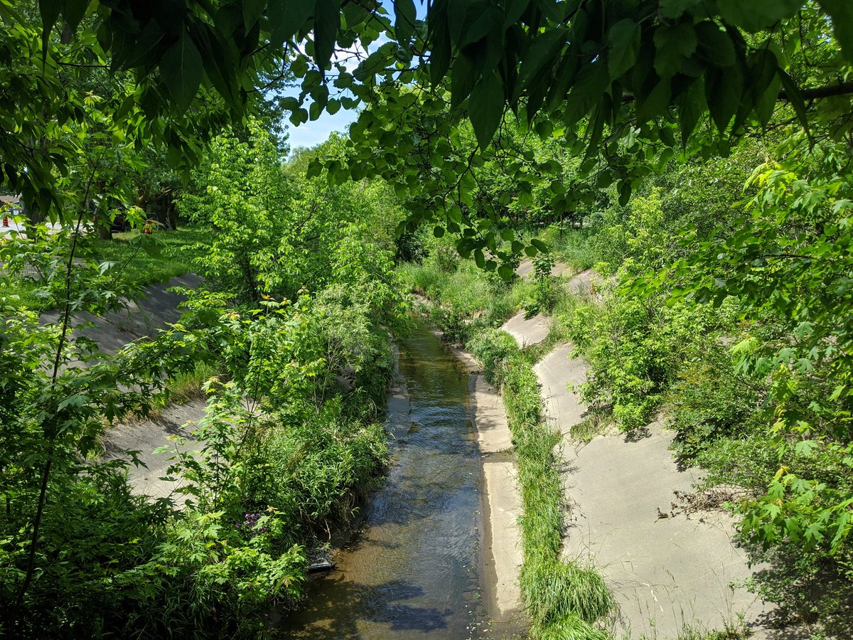 Still channelized, but the concrete banks are starting to disappear. There’s also a nice Greenway in this reach just begging for a formal trail.