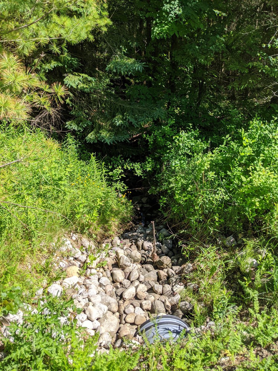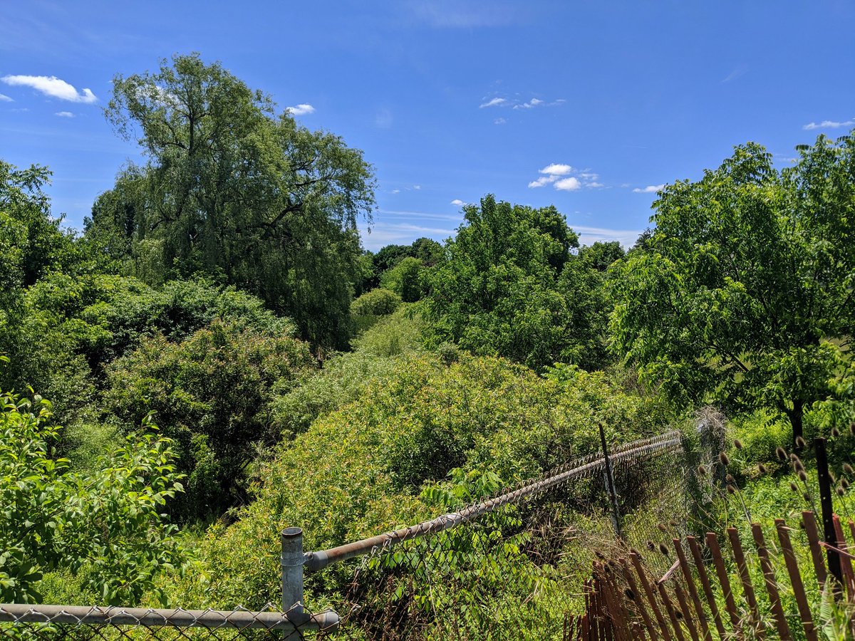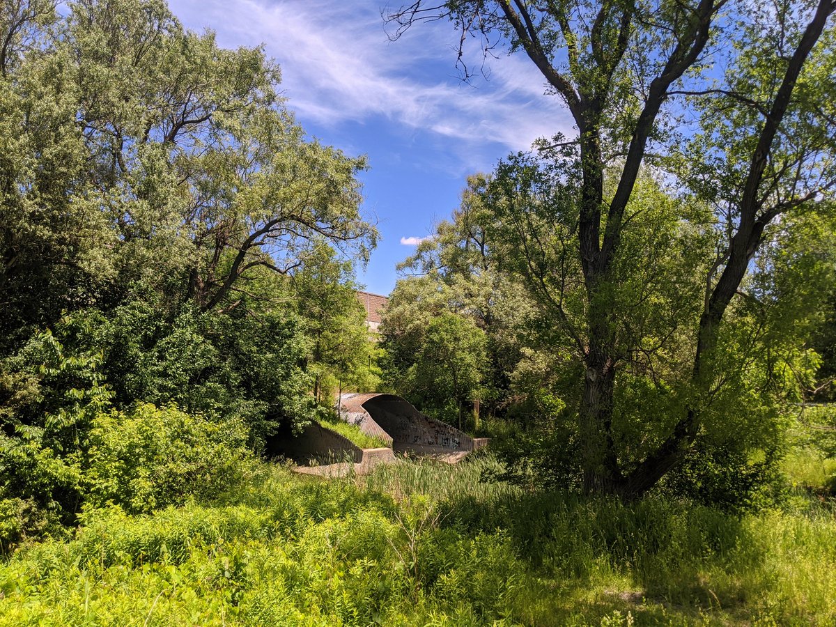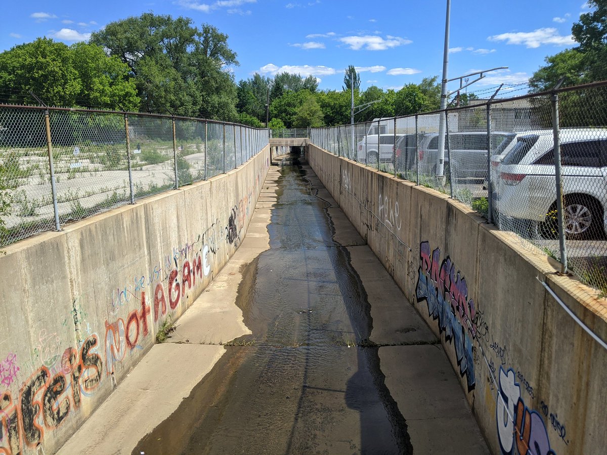 Apparently the creek is “private property” here. It gets buried into a culvert west of Courtland, until emerging again on the other side of the Huron Park Spur.