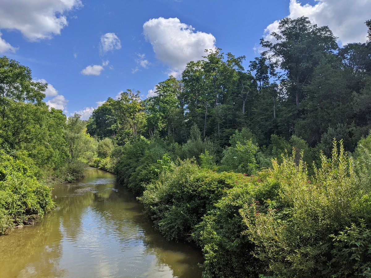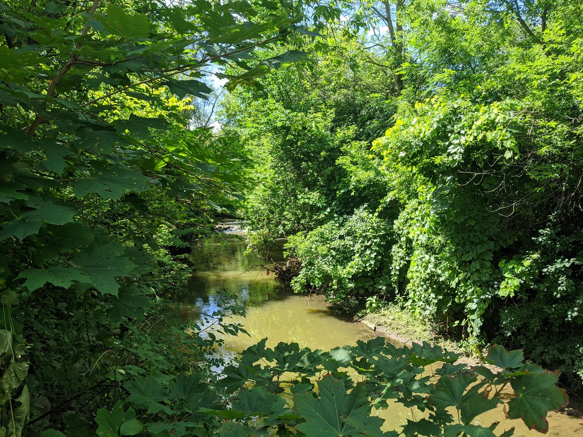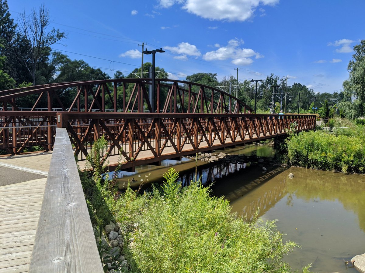 I’m back close to the creek. It meanders quite a bit here, and I’m sticking to the designated clear trails. I got shorts on and there’s lots of warnings about giant hogweed. The creek ducks under the Conestoga Parkway, I have to use the University Ave overpass to get back.