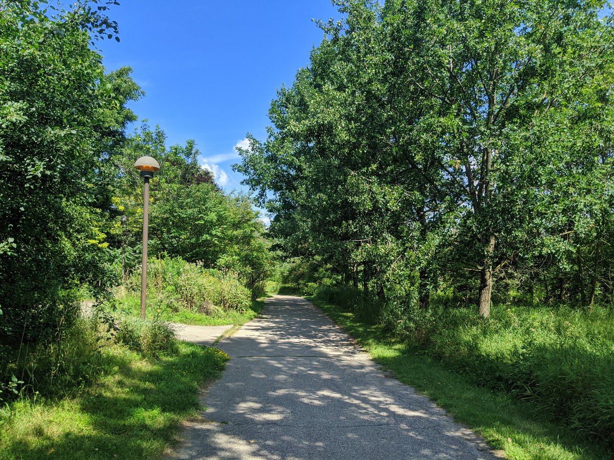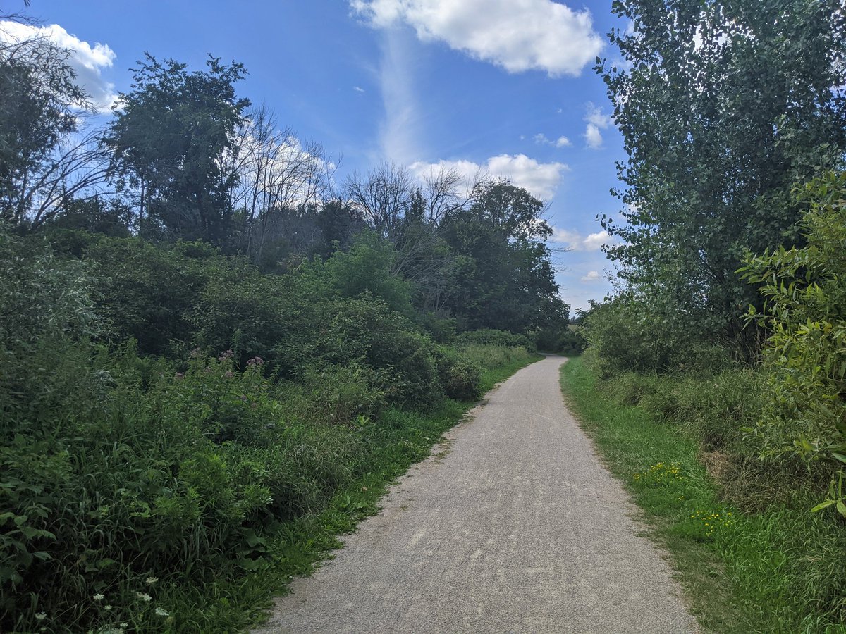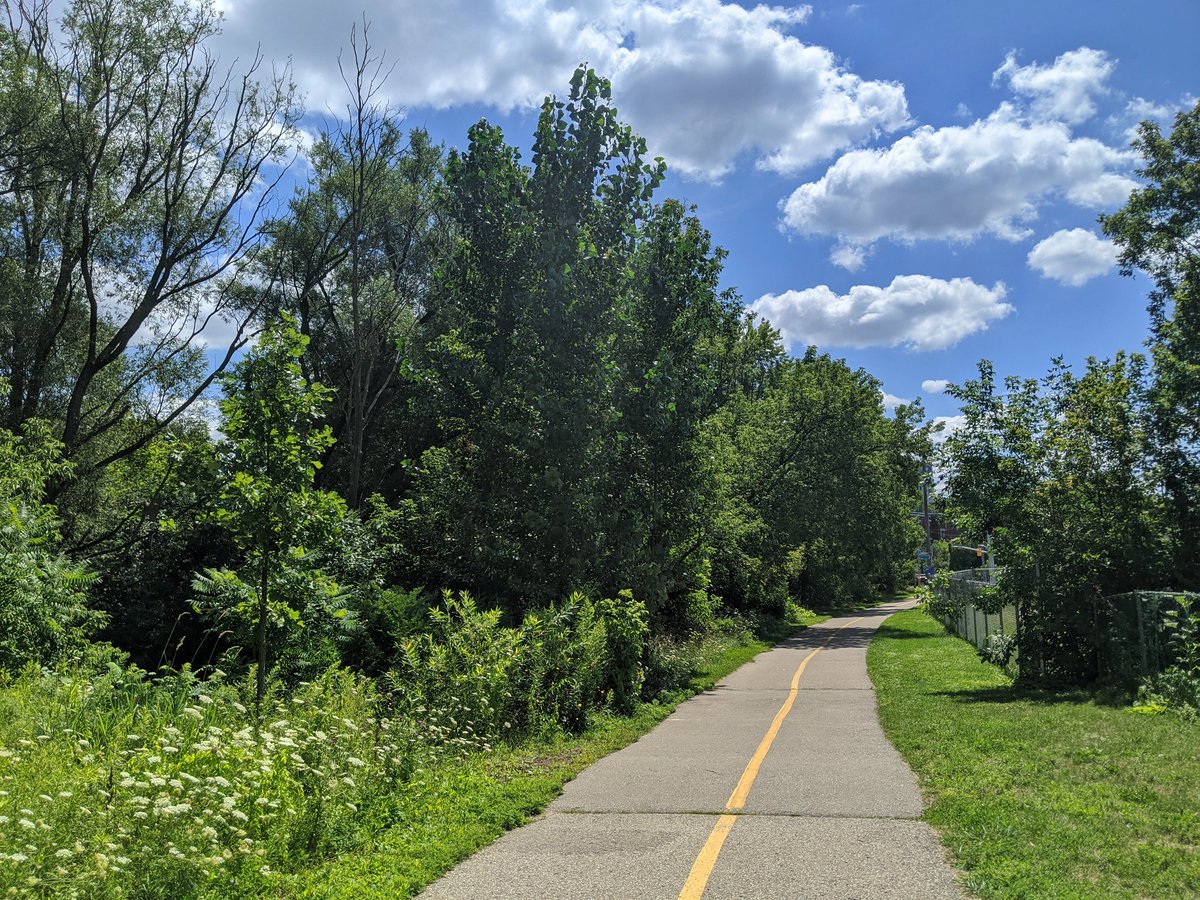 Fantastic. Alternating between asphalt and stonedust trails. It’s shady and lush down here, I can notice a couple degrees difference. Tall trees, wonderful vistas. This is rejuvenating.