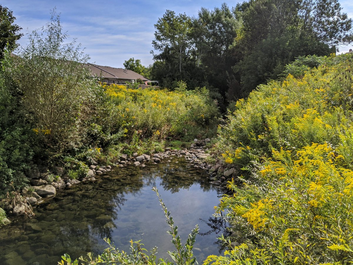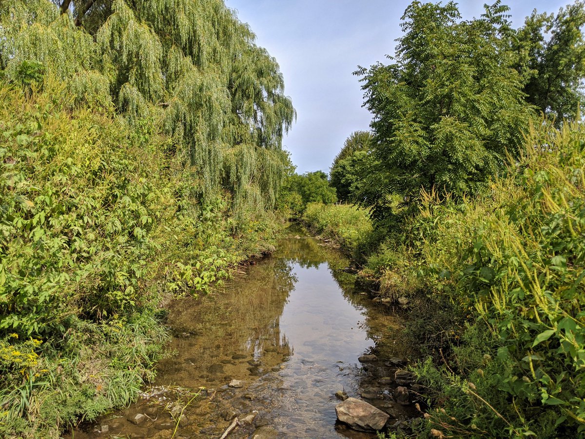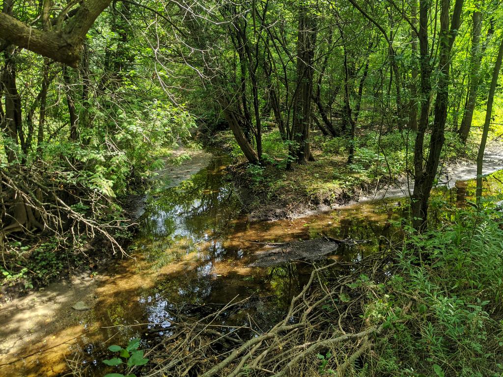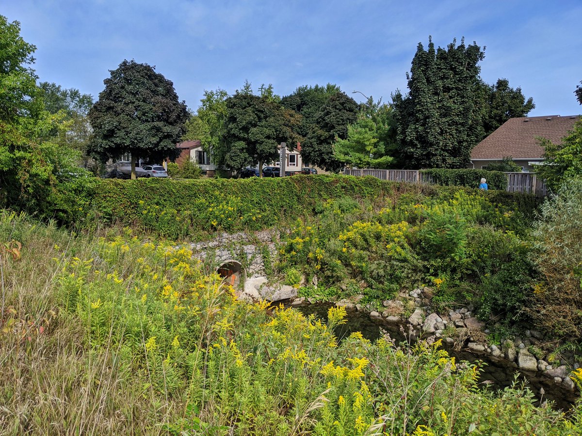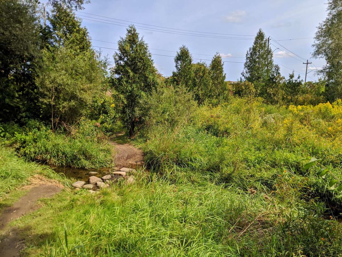 Good morning. Wonderful day for a walk. Today I will be tracing three different creeks. The first two, Balzer and Montgomery, are tributaries of Schneider Creek. The last is Kolb Creek, which drains directly into the Grand. We’ll start with Balzer though. Let’s go. Looking at the terrain, there no real way to tell where / if the headwaters started beyond here, but the first glimpse of Blazer Creek is off of Old Country Drive, at this outlet. Nice trail in parallel.