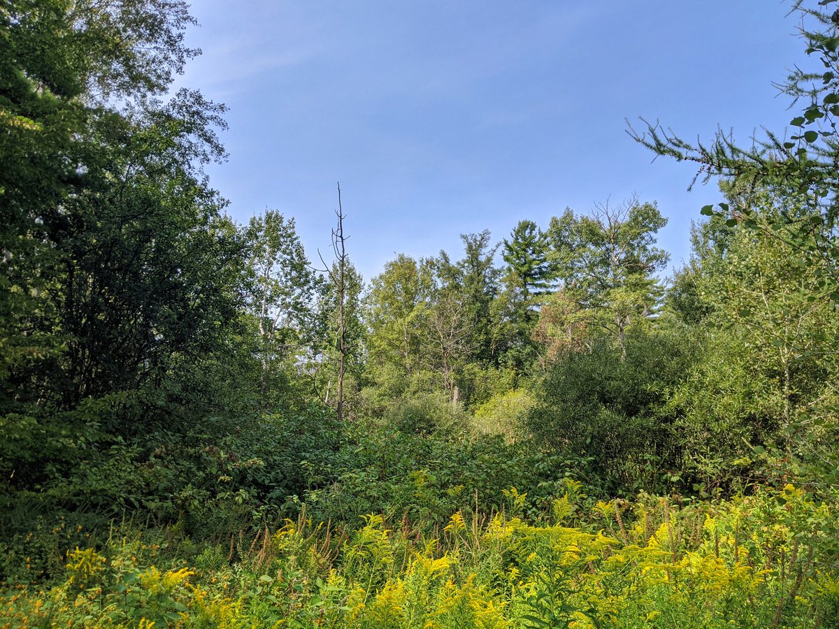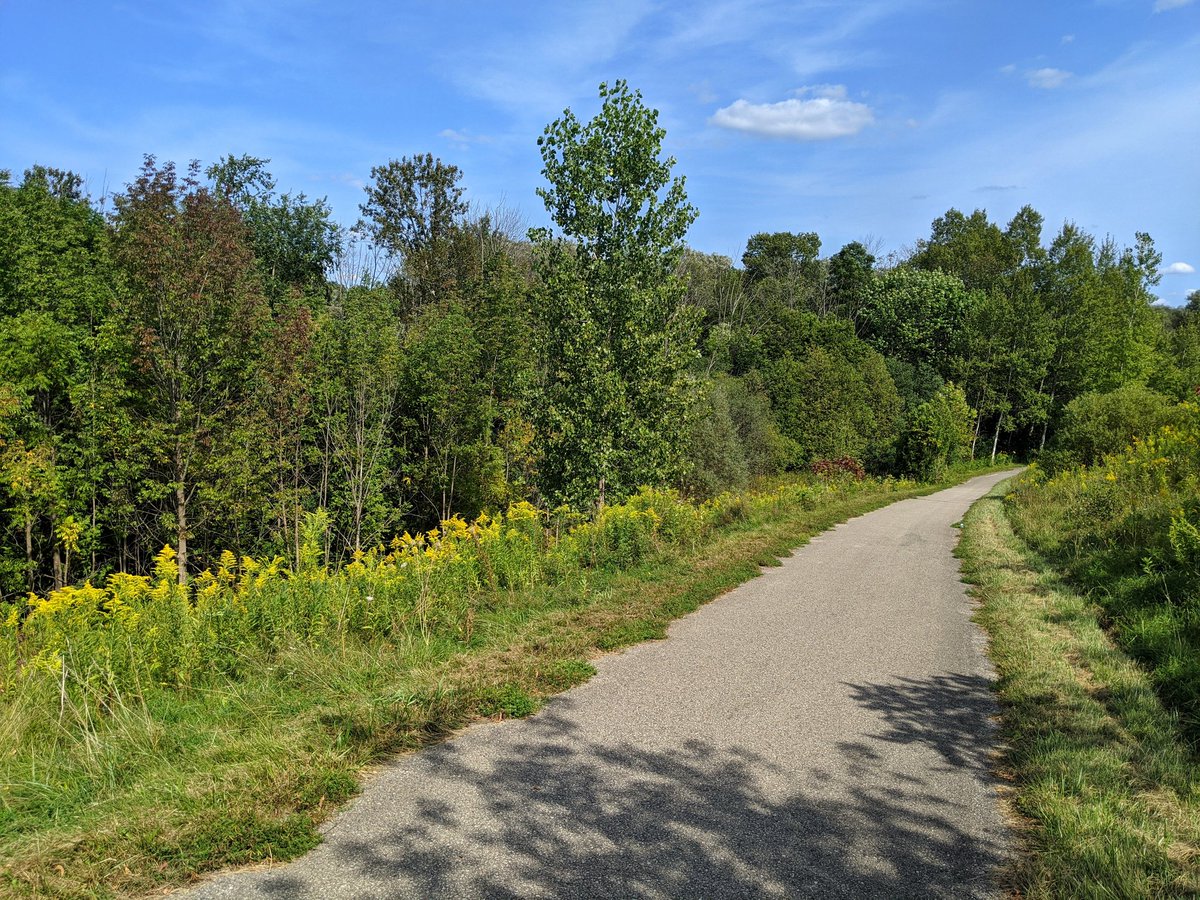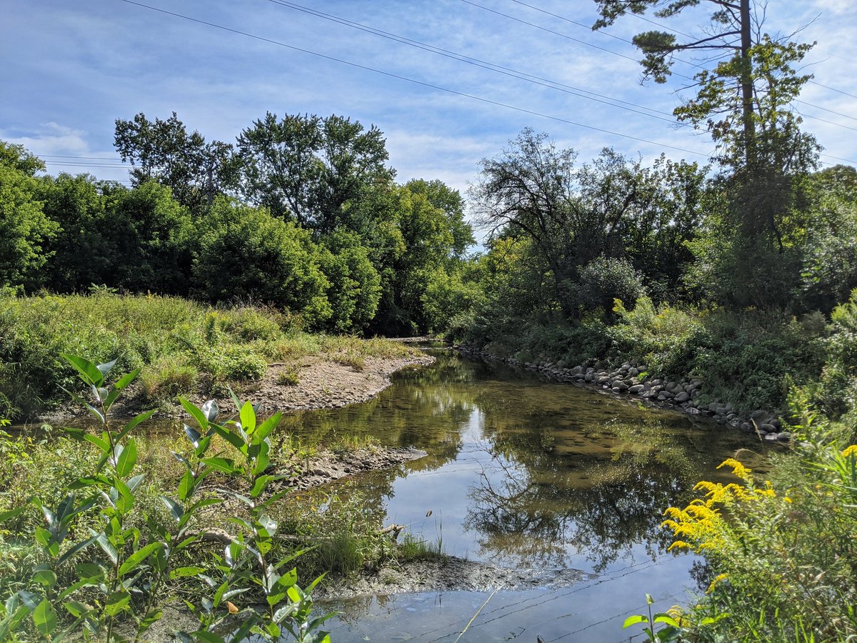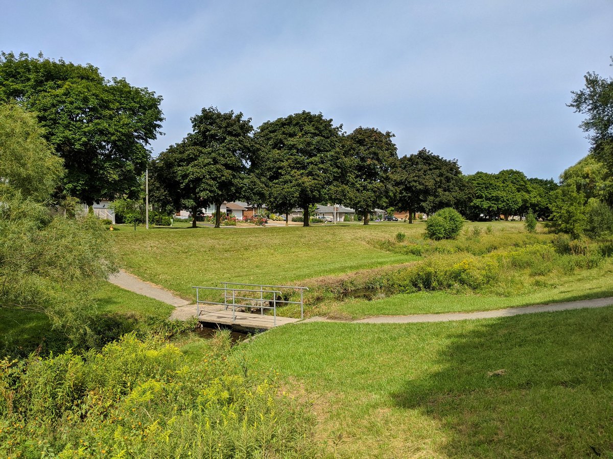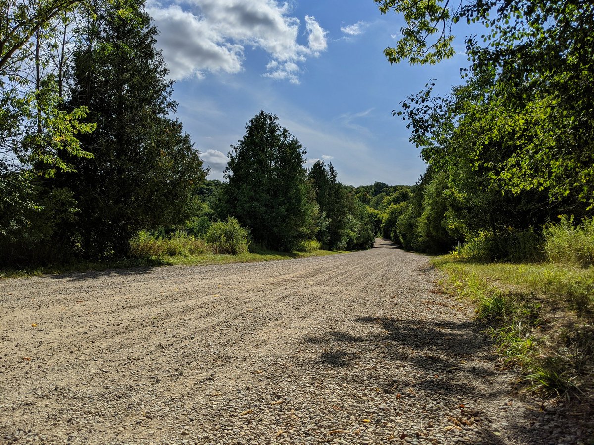 Good morning. Wonderful day for a walk. Today I will be tracing three different creeks. The first two, Balzer and Montgomery, are tributaries of Schneider Creek. The last is Kolb Creek, which drains directly into the Grand. We’ll start with Balzer though. Let’s go. Looking at the terrain, there no real way to tell where / if the headwaters started beyond here, but the first glimpse of Blazer Creek is off of Old Country Drive, at this outlet. Nice trail in parallel.