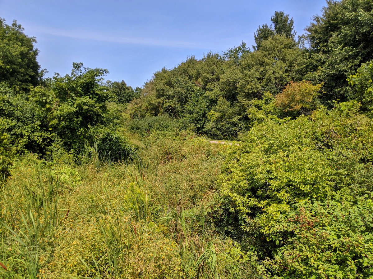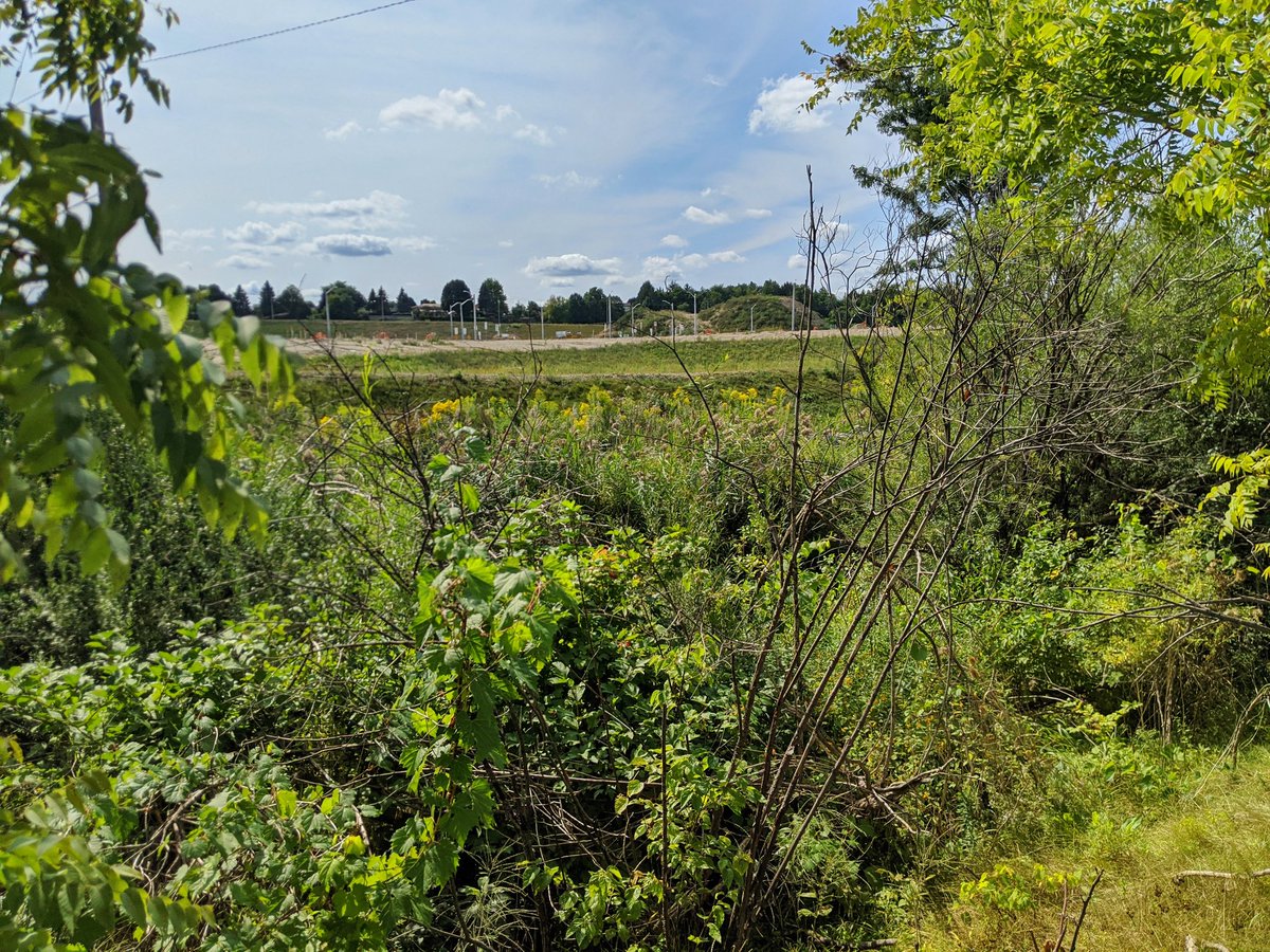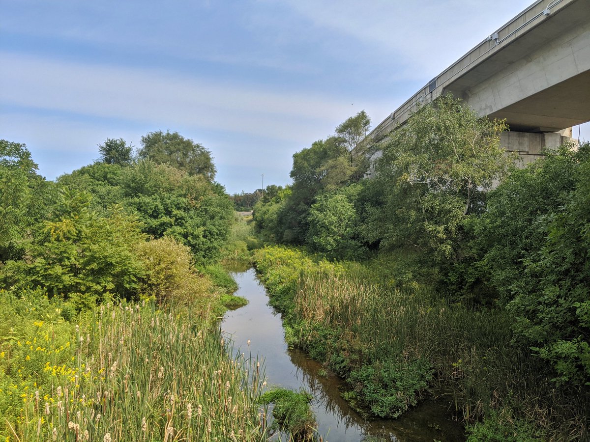 Going around and under the Conestoga Parkway, there’s a brief jaunt to Eckert Street, and then it opens again on the other side in this giant swath of excess land sandwiched by expressways and Dixon Street. It appears this doubles as a stormwater management pond.